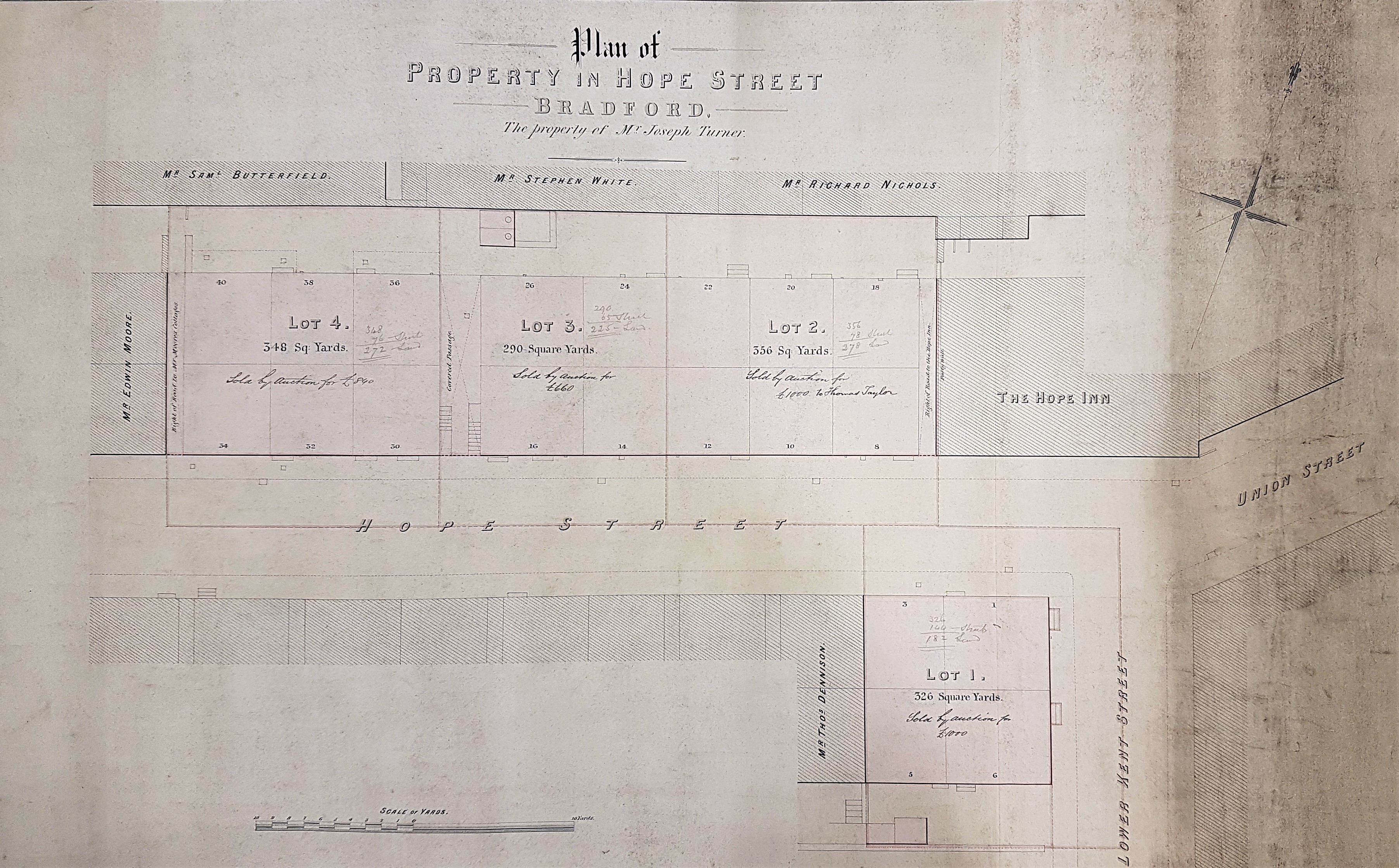 The full title of this plan is ‘Dixon & Hart: Plan of property in Hope Street (the property of Joseph Turner)’. It looks like a short terrace of back to back houses were being envisaged, immediately west of the Hope Inn. I admit that on the face of it the plan doesn’t seem to be very exciting, although the number of property owners’ names might facilitate some identifications in contemporary census reports. But, as will be seen, the plan has hidden depths.