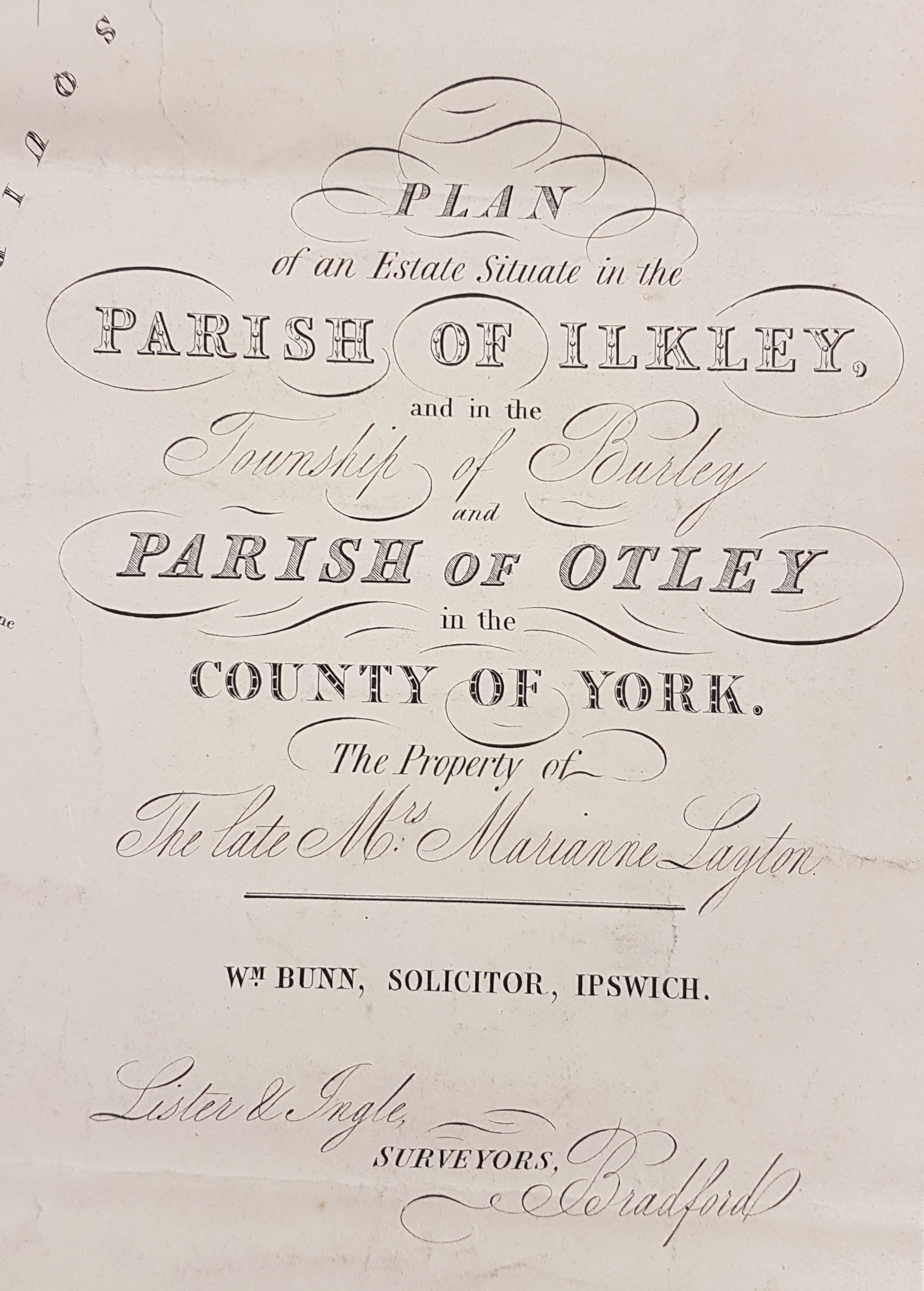 Evidently a firm of Ipswich solicitors, called William Bunn, instructed Lister & Ingle to prepare the map, and perhaps also undertake a sale or auction. The map is undated, as is so often the case, but I have established that a Marianne Layton died in Ipswich in 1844. I have assumed that her property was put up for sale soon after. The map includes Rowley Wood, and pre-dates the opening of the Otley-Ilkley railway. I have been told that this commenced in 1863 but the line is present on the first Ordnance Survey map of the area, originally published in 1851.