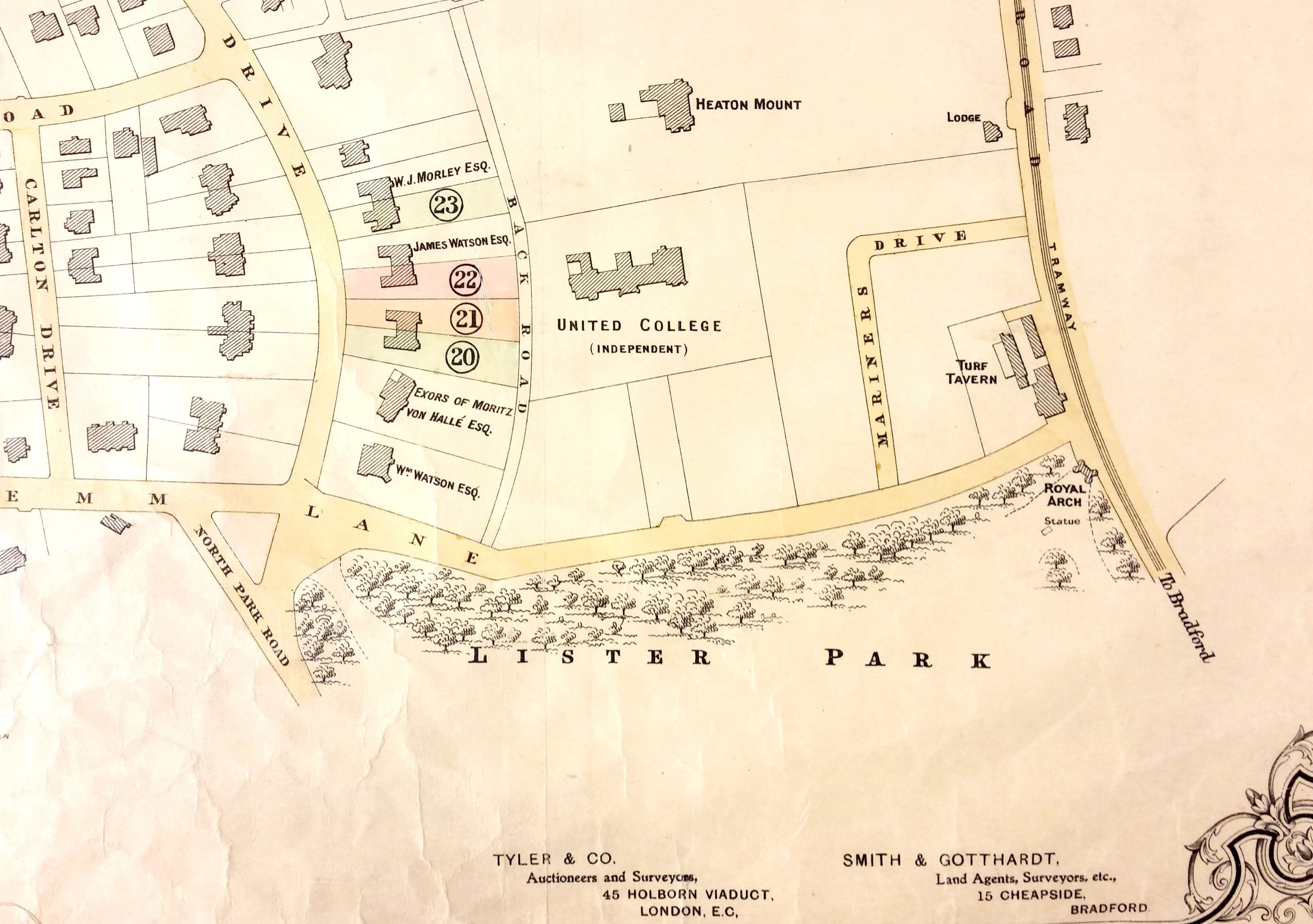 The owner of the Turf Tavern estate at the time of the first map is likely to have been William Lister Marriner of Greengate House, Keighley. His family came into property around Frizinghall by marriage. Local historian the late Tony Woods confirmed their possession of this area from the Heaton Local Board Rate Books 1860s-1881 (WYAS Bradford Archives BBT6/5/5/1-19). The same family also gave their name to nearby Marriner’s Drive. This roadway is not present on the 1906 OS map but appears on the 1911 Rosse sale plan, without as yet any attendant houses. The sale plan was produced because in 1911 the 5th Earl sold off all his remaining property in Heaton and Shipley and consolidated his estates in Ireland.
