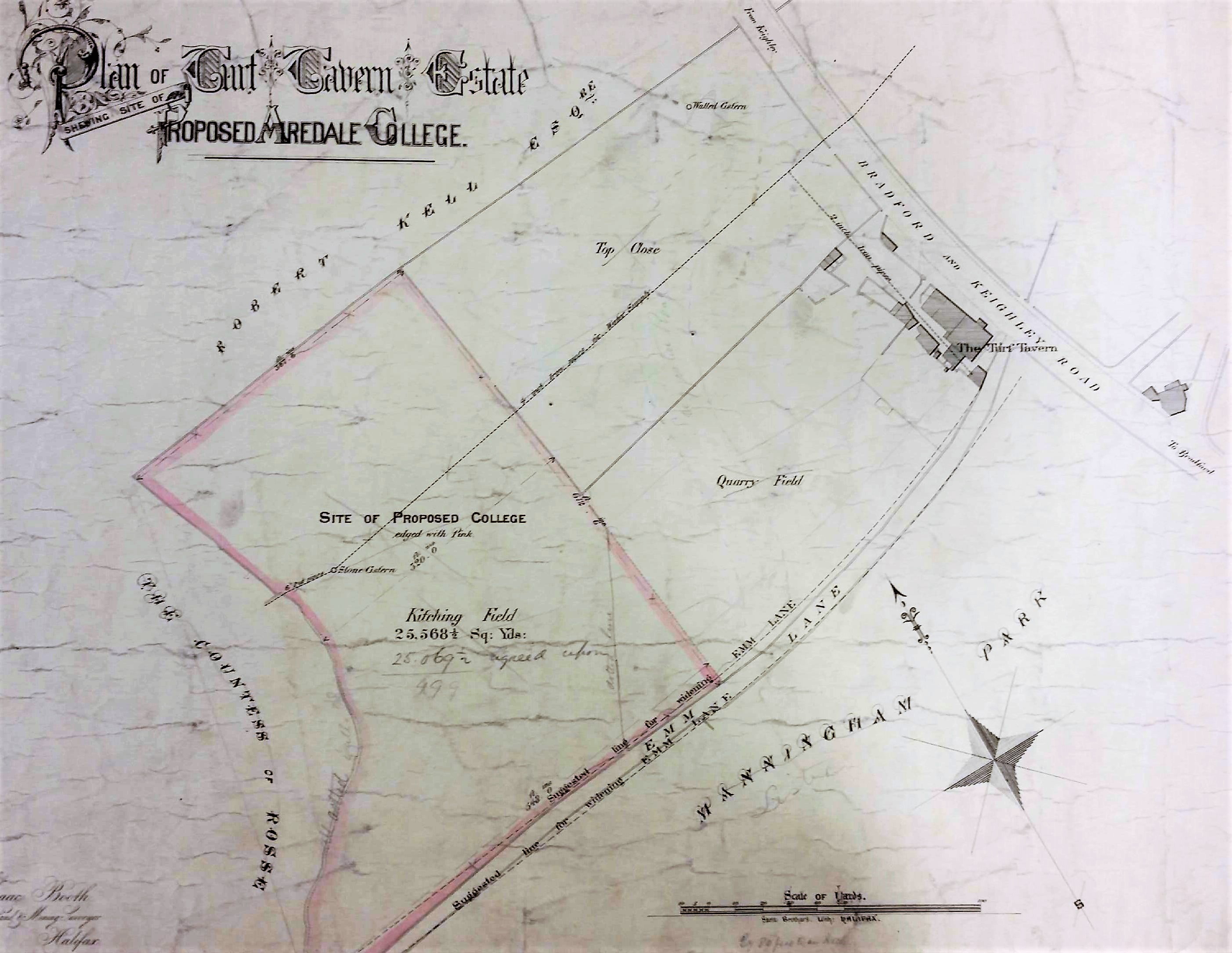 I would imagine that the plan probably dates from c.1875 since it shows a block of land near the corner of Emm Lane and Keighley Road on which it was proposed to build ‘Airedale College’. This was to be dedicated to the training of Congregationalist ministers. An earlier college had been in existence at Undercliffe since 1831. Possibly a larger building was needed to train additional applicants, or perhaps the development of Undercliffe Cemetery by a private company made the environment of the original college less desirable. The new premises at Heaton were finally opened in 1877.