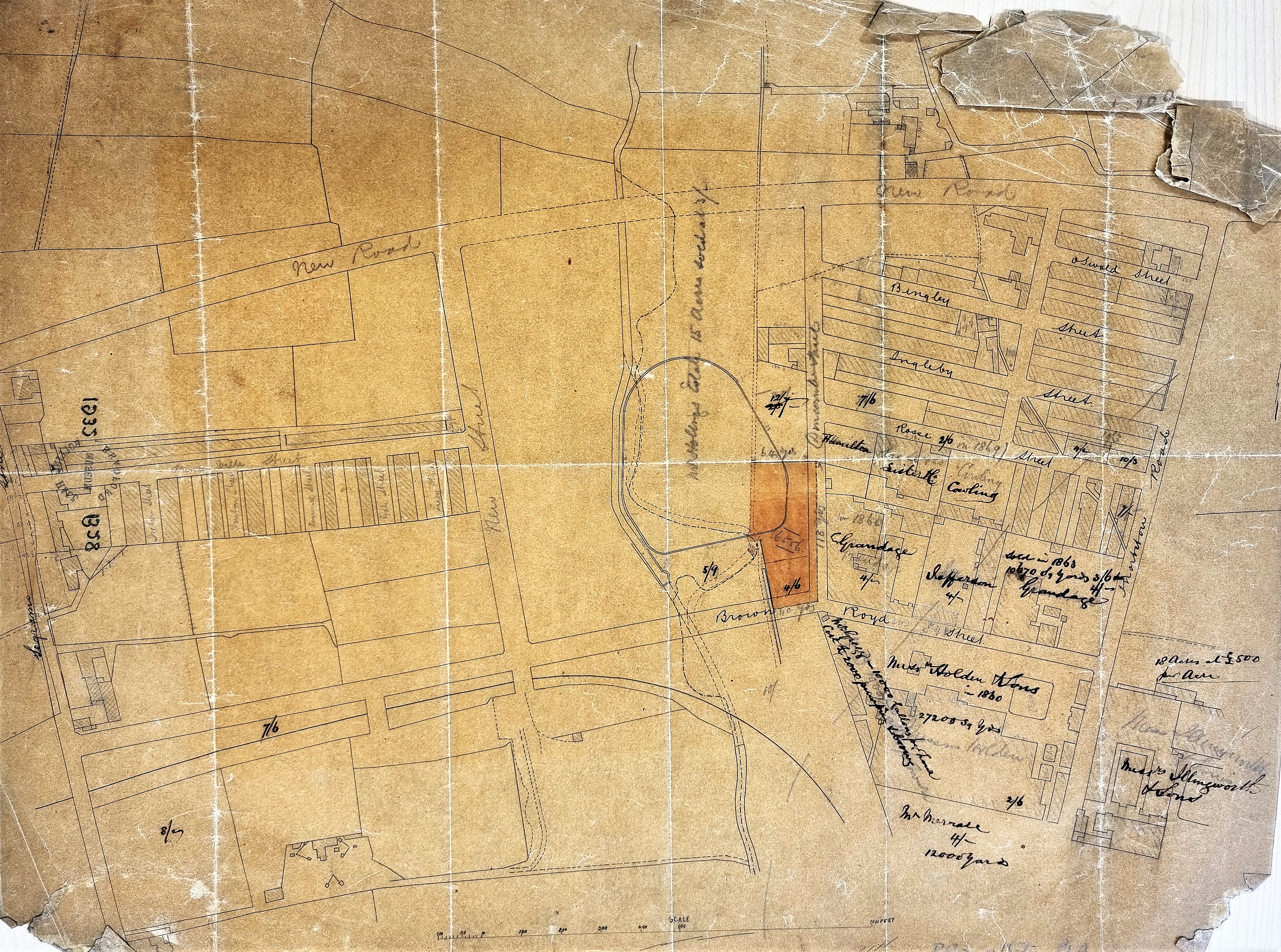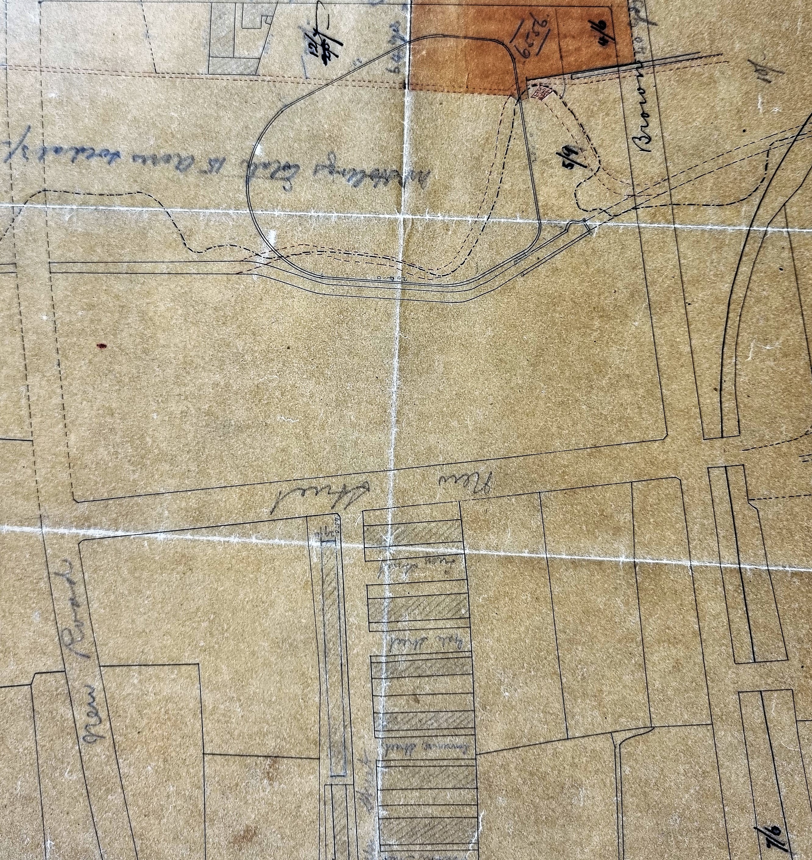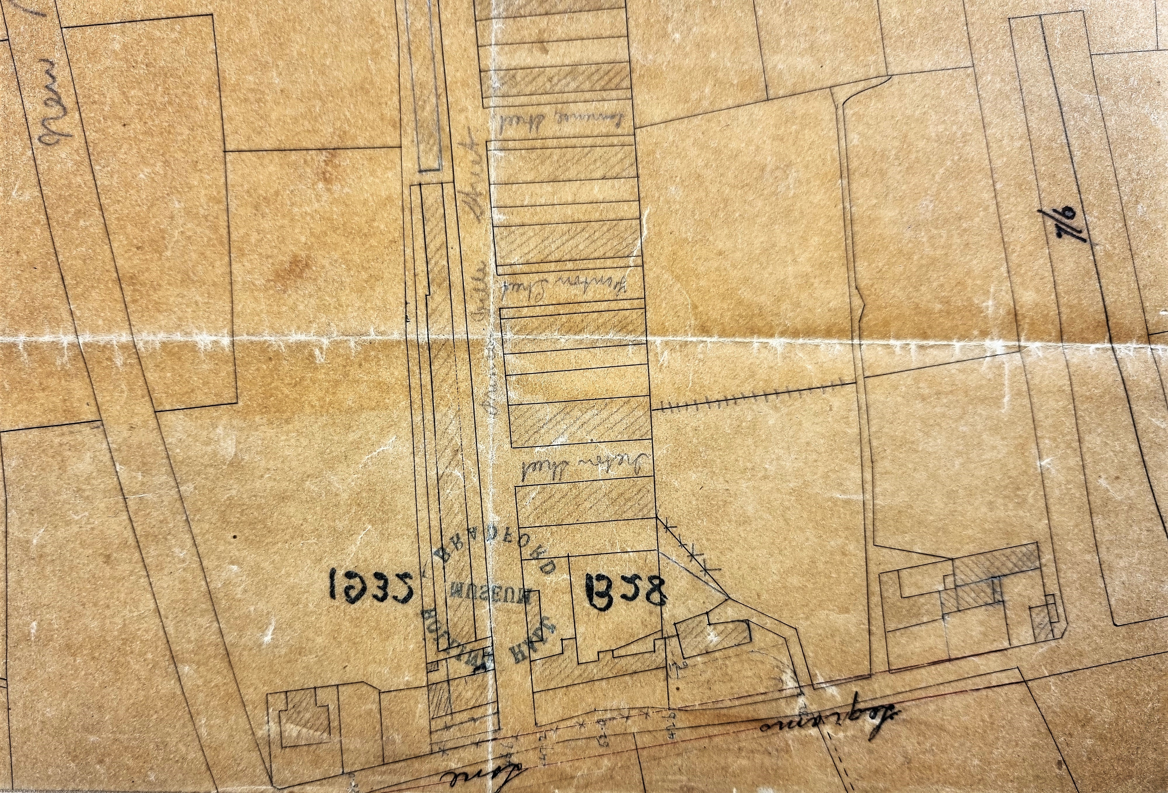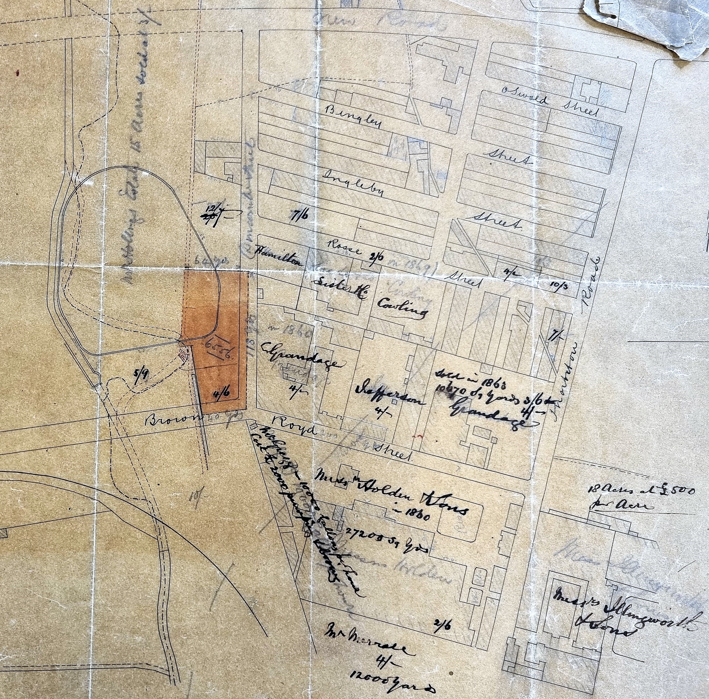 I cannot be completely sure we have an entire map since its condition is so poor. As usual the map is not dated and its original purpose is unclear. I imagine a block plan of the area was originally copied on to tracing paper which accounts for the fine ink lines. Over this copy comments both in pencil and ink were added later. Some of these comments are probably contemporary, but others quite definitely record historical information. The base map includes the track of the City Road Railway branch line, which led to the City Road goods station. This must indicate a date of around 1875 or even later. But if you look at the hand-written comments added you will see the names of some of the commercial landowners are together with dates from the 1860s.