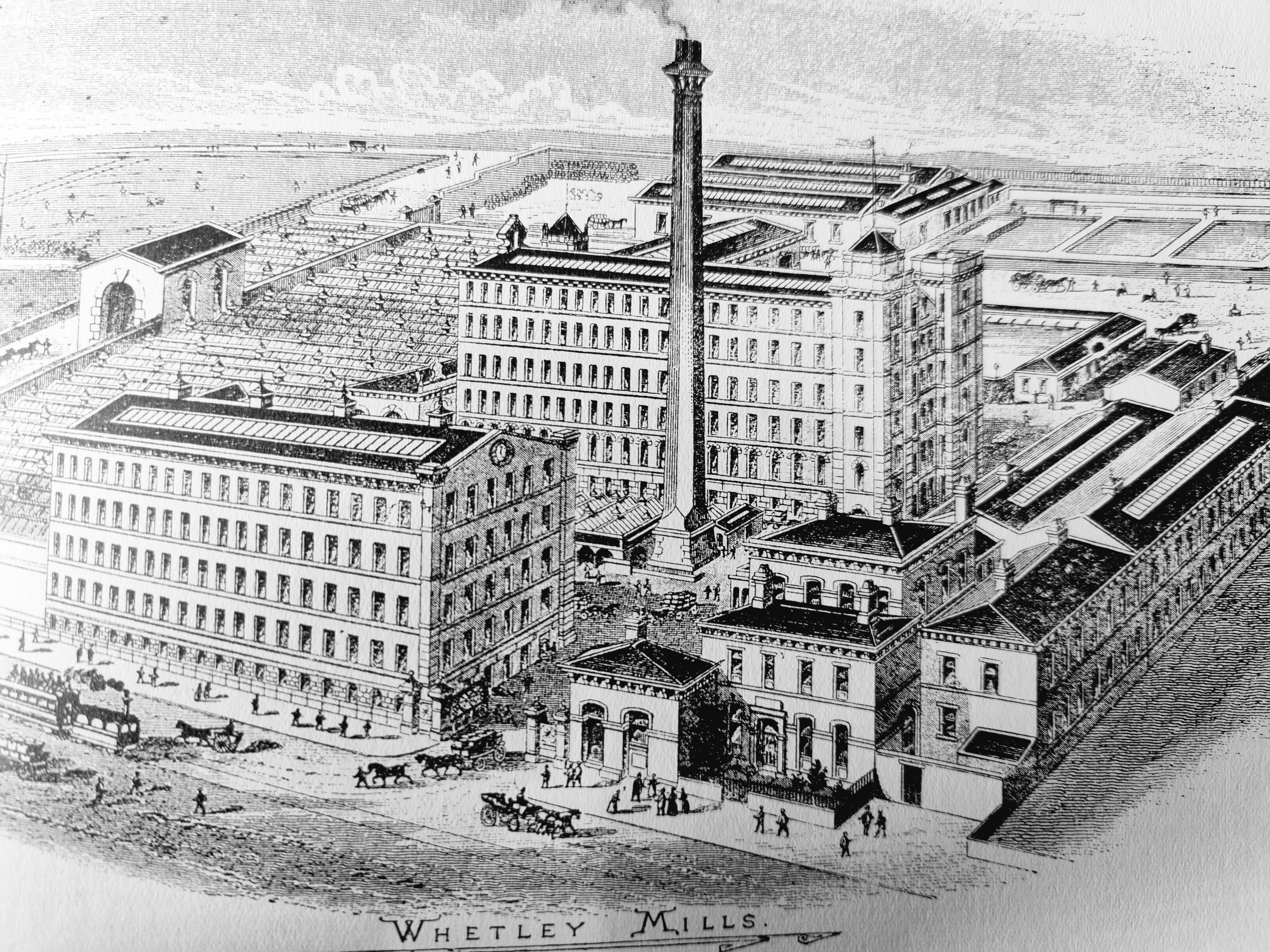 It is easy to find this area today on Google Earth but ‘the old order changeth’ and there has been wholesale demolition and further redevelopment. Rather than provide an image of wholesale destruction I shall finish with a dignified building: Whetley Mills in its prime. Note the steam tram!