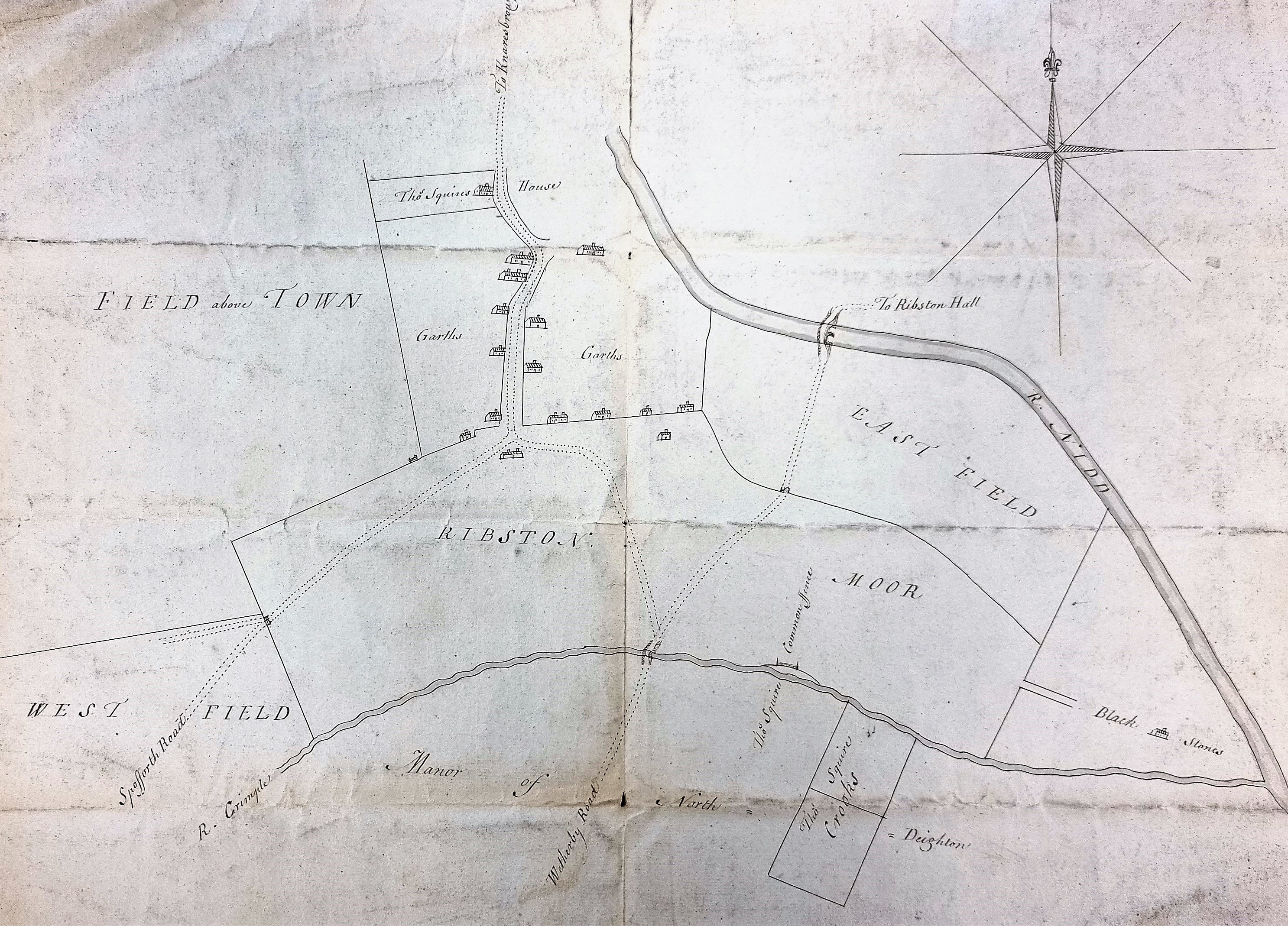 Ribston Moor is between Harrogate & Knaresborough. At the base of the map is a section from the neighbouring manor of North Deighton. The plan shows the confluence of the rivers Crimple and Nidd at Blackstones, which means you can identify its location exactly. This makes comparison with the first Ordnance Survey map of the area (surveyed late 1840s) very easy. If we do at comparison then it is clear that the River Crimple meanders far more than our plan suggests. The plan indicates that the land is sub-divided into common land (moor) and three great fields: East Field, West Field, and Field above Town. By the time of the OS map the common land has been enclosed and the great fields subdivided. I assume that the bridge over the river Crimple is the Crimple or Ribston Bridge. The bridge over the Nidd, which looks fairly impressive on our plan, has withered away to a mere ‘wooden bridge’ on the OS map.