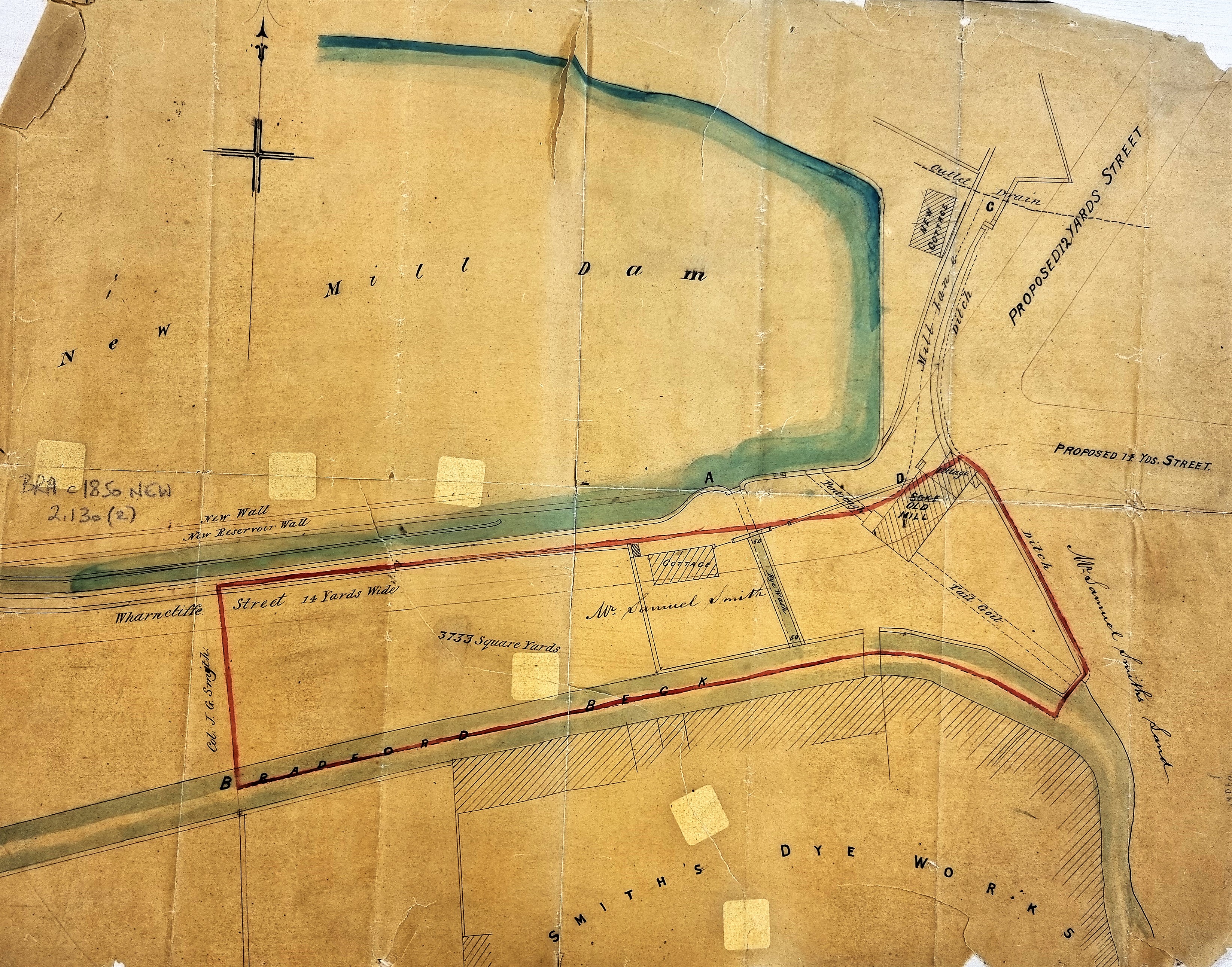 I imagine that the purpose of this plan is essentially to support the sale of the land between Bradford Beck and dam, which is outlined in red. One reasonable assumption is that if our plan pre-dates the first OS map the ownership of the dyeworks has changed from Field’s to Smith’s Dye Works. But, in fact, we are probably looking at the same enterprise namely that of Samuel Smith (stuff dyer), who in an 1850 directory was placed at Field Dyehouse, Thornton Road. Stuffs were worsted pieces. A fire occurred at ‘Smith’s Dye Works’ in March 1848 (Bradford Observer). Samuel Smith is probably the landowner selling the outlined section of land; other landowners in this general area, who are not mentioned on this plan, were George Baron of Clockhouse Estate and Thomas Hollins of West House, Toller Lane (stuff manufacturer).