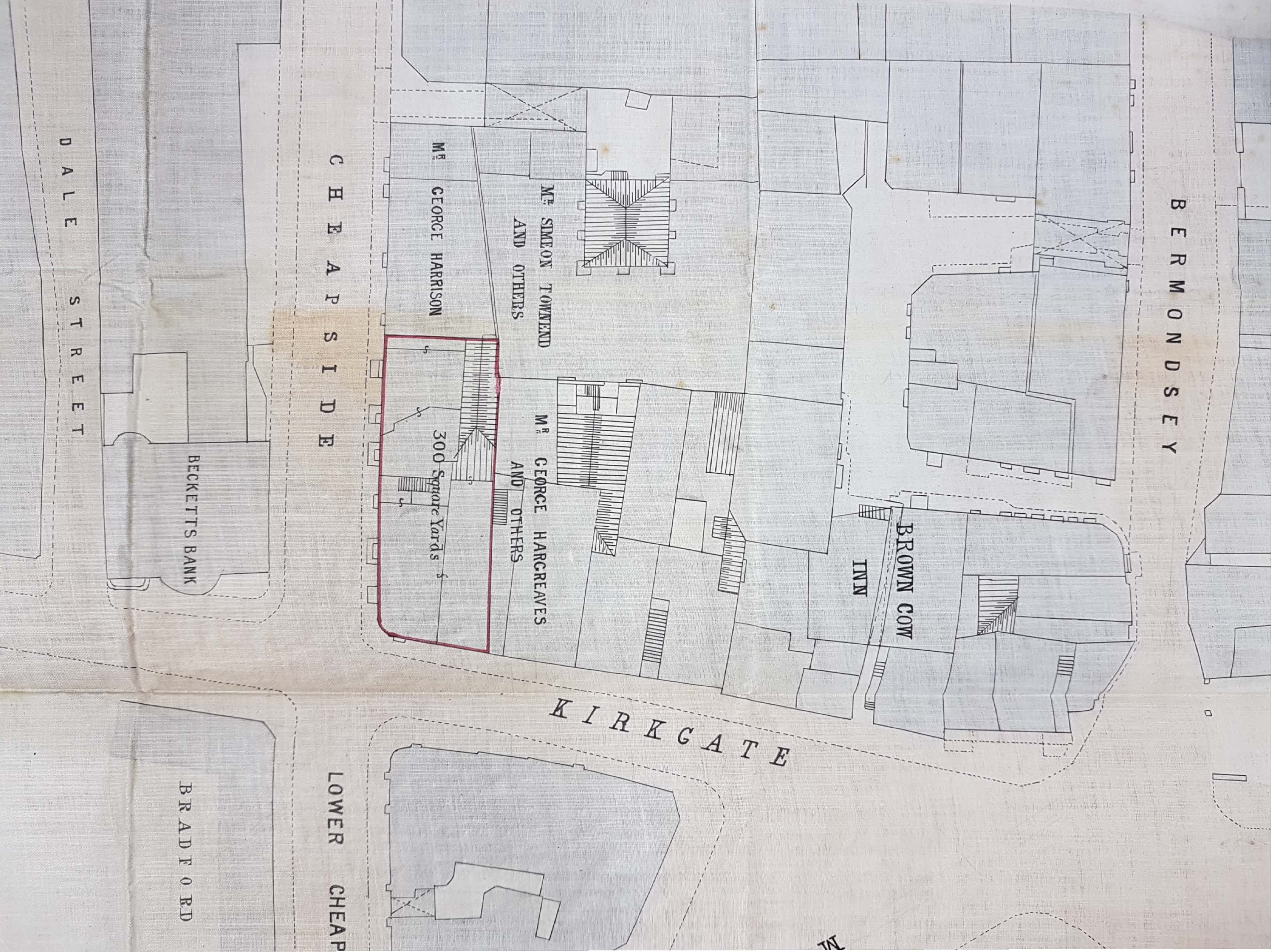 A landowner mentioned on the plans is Simeon Townend. In the 1851 census a man with this slightly unusual name was a worsted merchant living in Upper Kipping, Thornton. G & W Townend were wool merchants at 22 Cheapside. The company George Harrison & Sons were printers at 14,16 Cheapside.