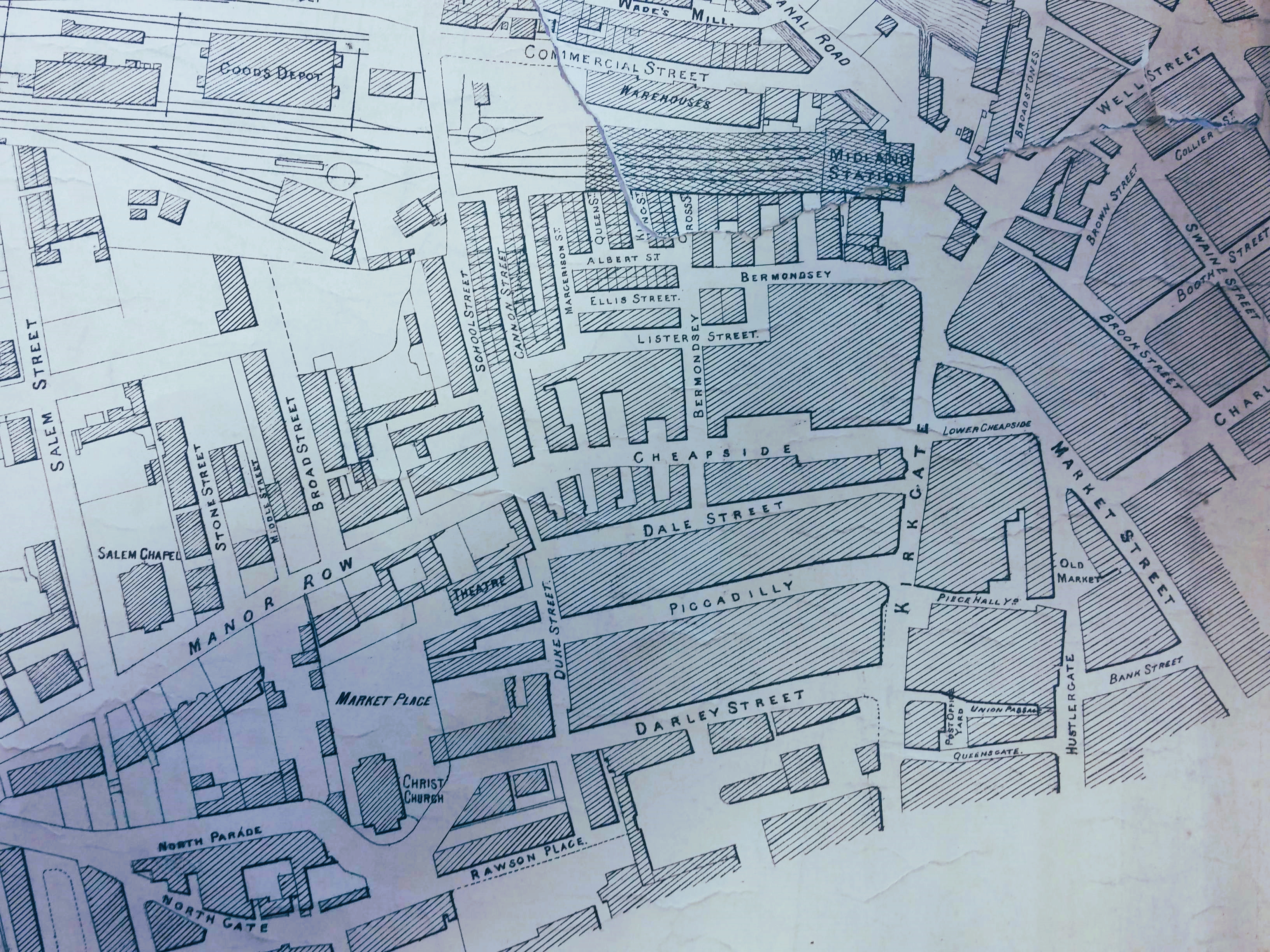 Naturally there is a great deal of history locked up in street names. Hustlergate must be named after John Hustler, and Market Street must reflect the old market. But look at the streets at the top right of the second map. A water source is the obvious explanation for Well Street. The Swaines and the Booths were wealthy local families and Charles St, Booth St, and Swaine St probably all derived their names from Charles Swaine Booth Sharp (1734-1805) who owned land in the area of Hall Ings and married Hannah Gilpin Sharp, who had inherited Abraham Sharp’s Horton estate via his niece Faith Sawrey. The name Brook St must, I assume, reflect the course of the Bradford Beck. This is seemingly on the surface before 1849, but 1863 the map indicates that it was by then culverted and underground at this point. The names Well St and Market St have survived to the present day.