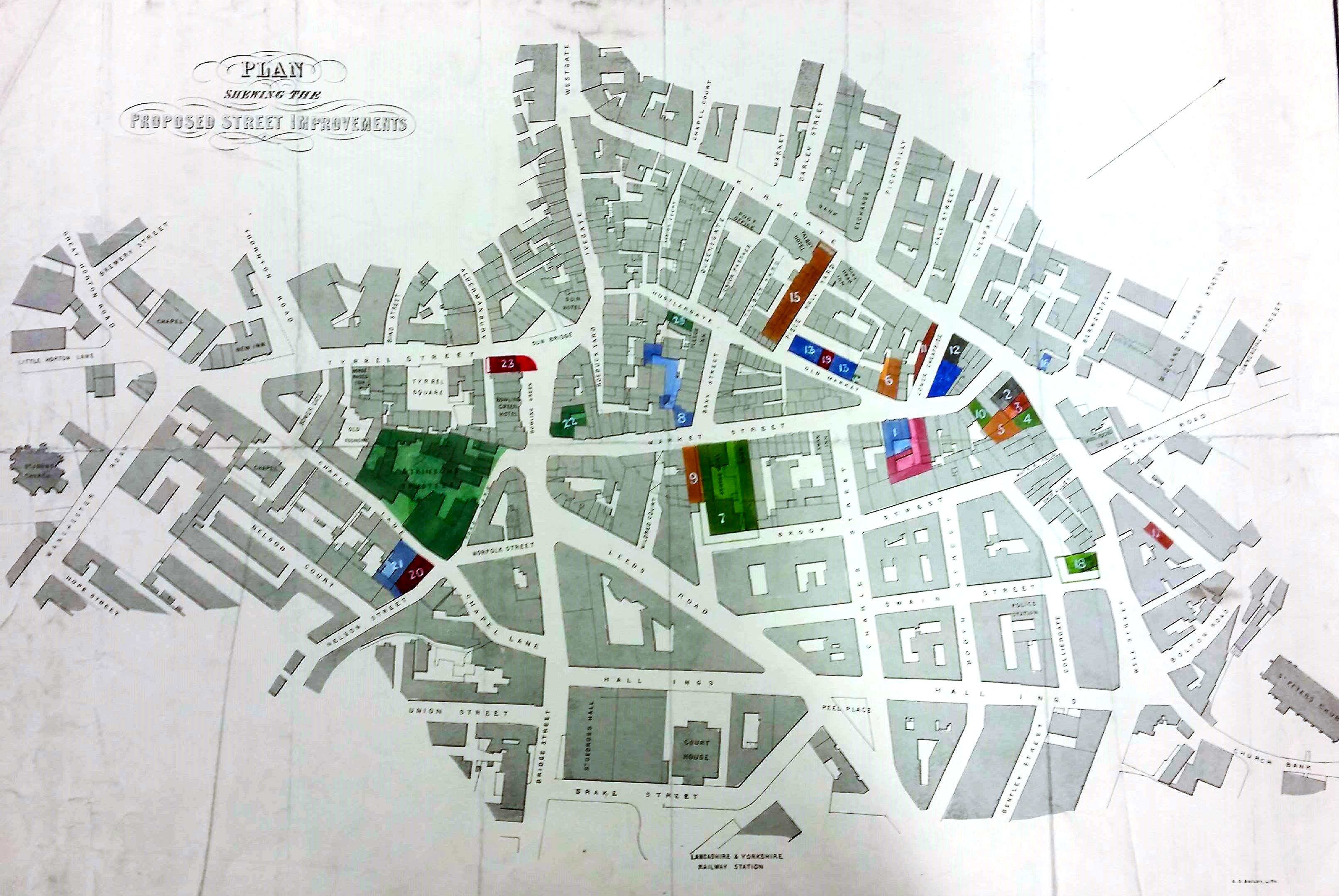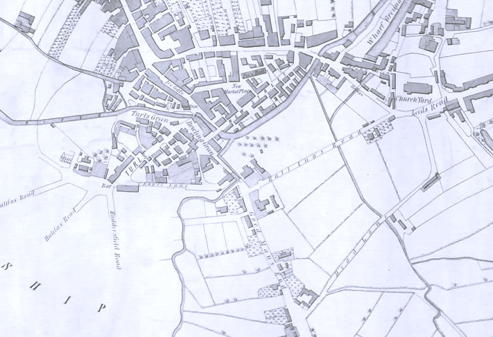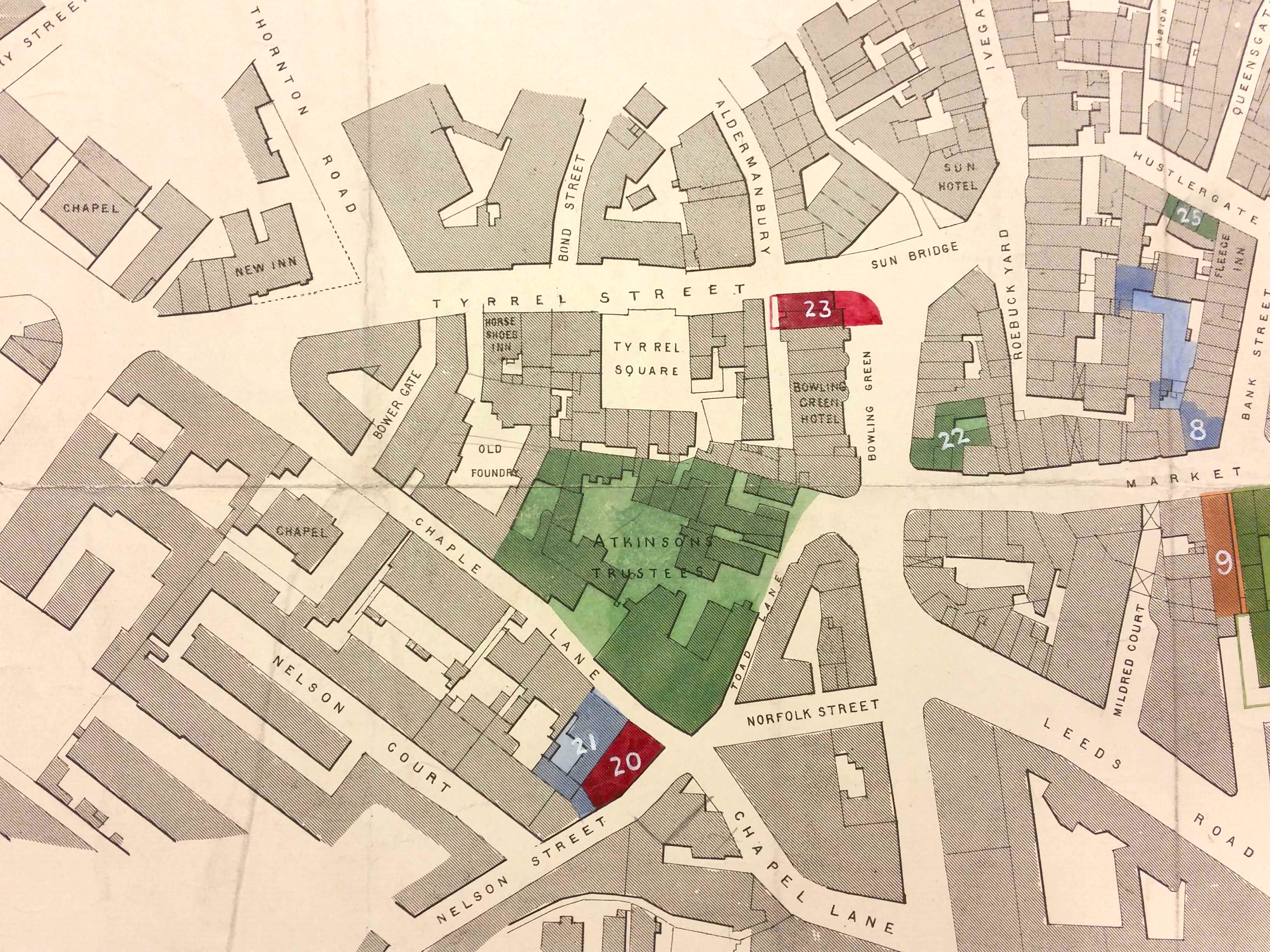 The specific reasons behind the production of this particular map is not the issue here, although it probably wouldn’t be too difficult to trace the Atkinson’s Trustees who are included. The map is undated but St George’s Hall has been built so the plan is later than 1853 but there is no Town Hall yet, so it clearly pre-dates 1873. It closely resembles the 1861 Bradford map so a portrait of the borough around 1860 seems a reasonable conclusion. You might care to wander, in your imagination at least, around the central section of the plan (shown as a detail) with its long forgotten inns, chapels and courts.