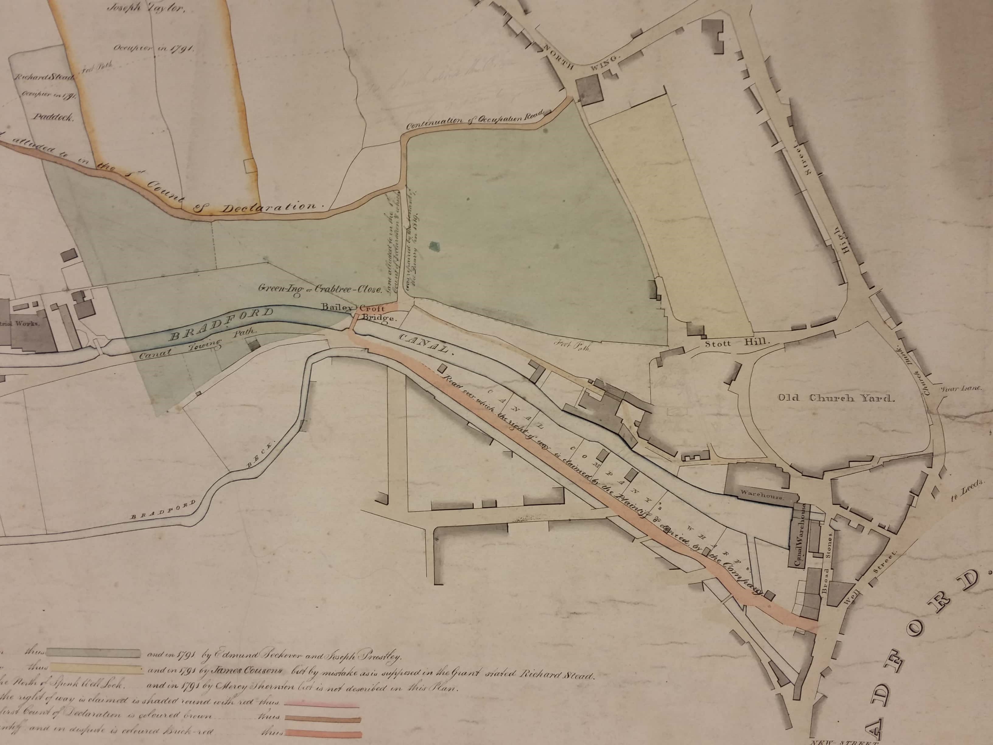 The first, from 1820, clearly shows (in the bottom right corner) the area of interest. The earlier plan and illustration did not indicate how close Broad Stones was to the canal terminal and its warehouses. At this time it evidently opened into a space in front of the church steps and Bolton Road doesn’t exist.