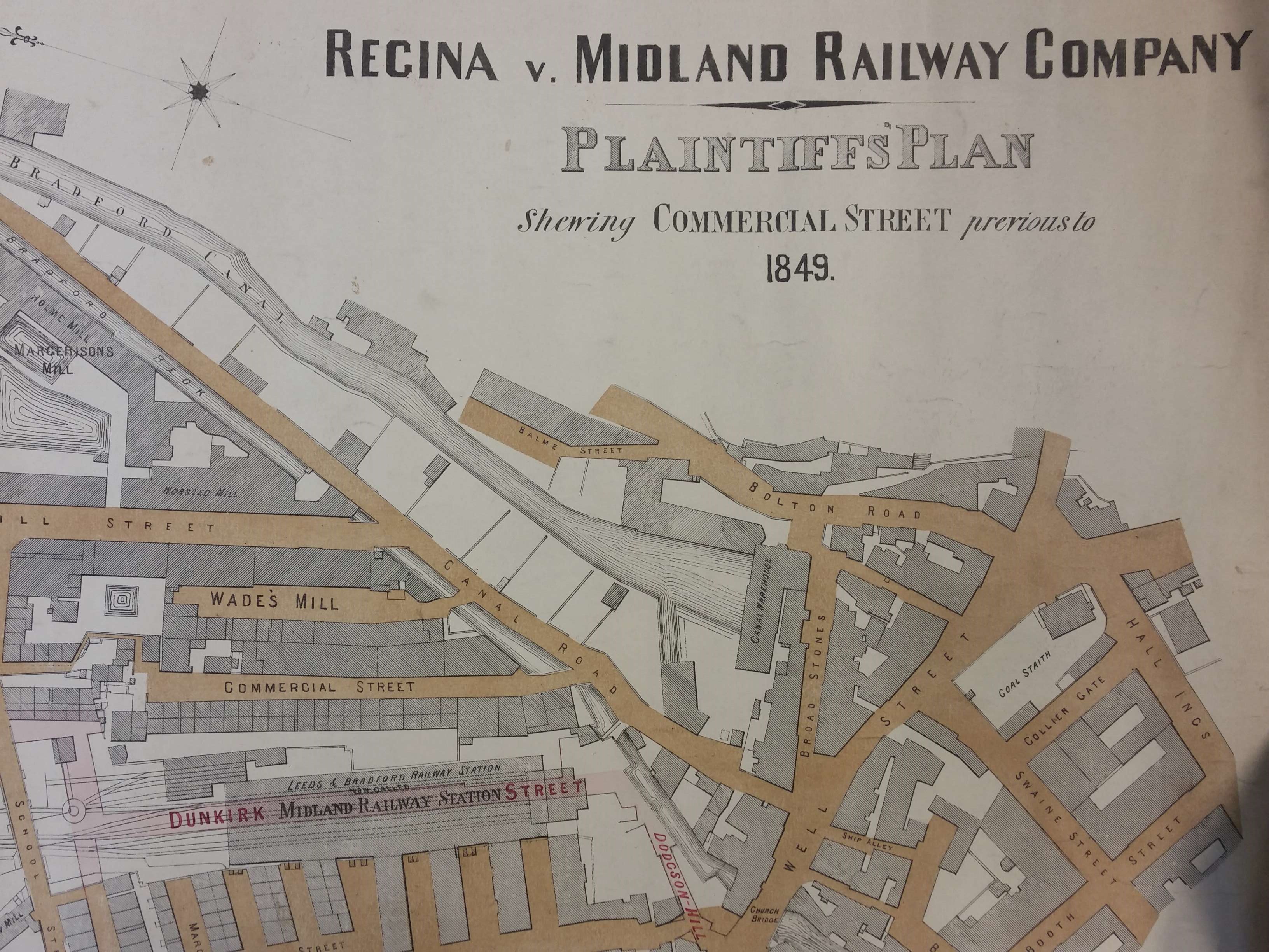 A generation later, in 1849, Broad Stones is still evident, but the open space has vanished as Bolton Road has now been constructed. In this map notice the Well Street coal staithe (owned by the Low Moor Iron Co.) which has featured in this series on several previous occasions. Note also, the arrival of the railway and that Church Bridge does actually cross a flowing surface portion of the Bradford Beck.