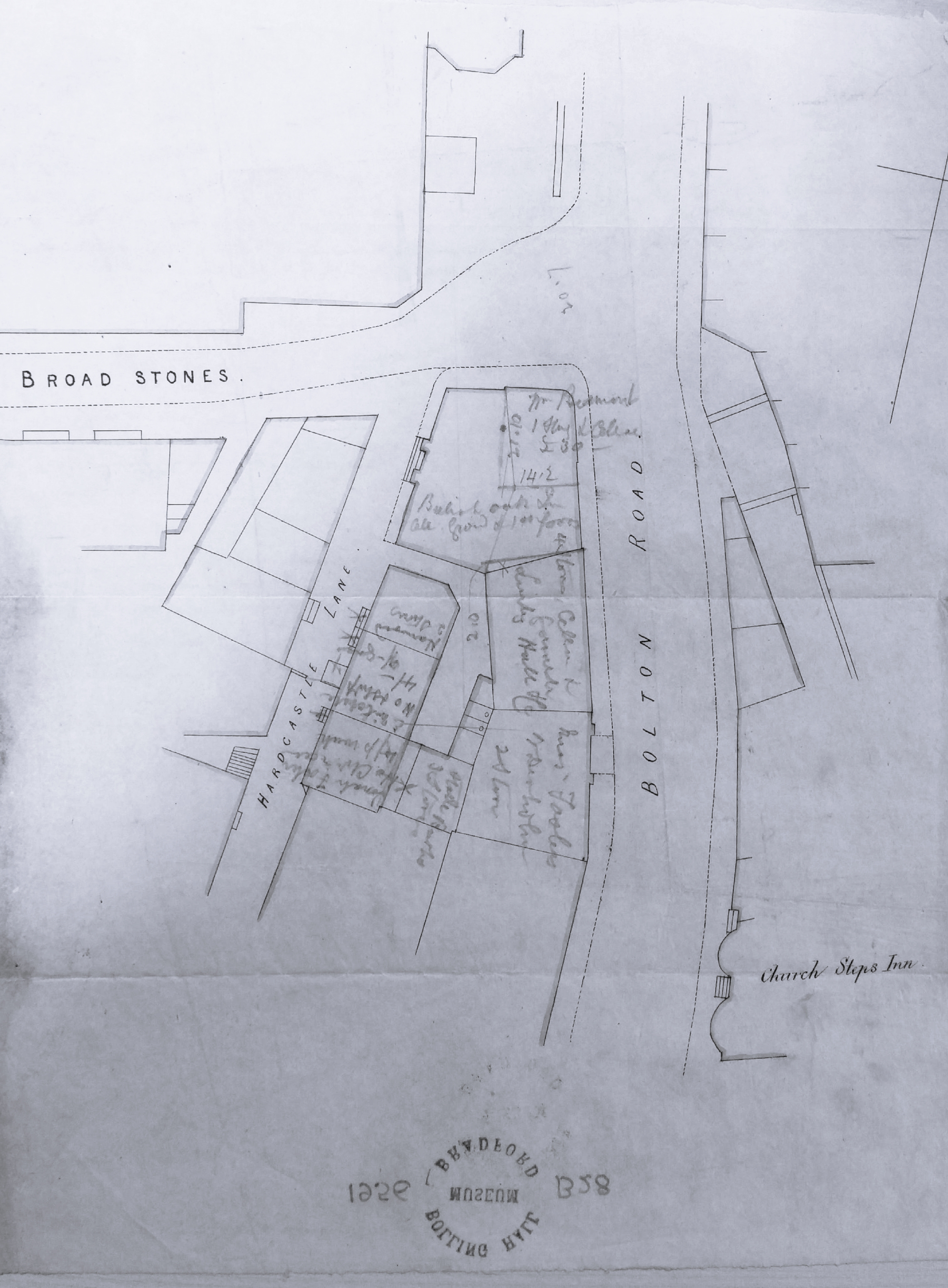 My search for Broad Stones began with this little plan from the Local Studies Library reserve collection. It is undated but pencil annotations seem to be providing details concerning adjacent properties, including occupiers, areas and valuations. At the junction of Broad Stones, Hardcastle Lane and Bolton Road is the situation of an business which (in pencil) seems to be the British Oak Inn, but I’ve totally failed to find this in trade directories. Of the other occupiers: Jonah Foster, E Mitchell, Burke, & Harwood (2 stories) the only one I’m reasonably sure of is Greenwood Harwood, a whitesmith at 12 Hardcastle Lane in the 1861 Bradford Directory. On this rather tentative basis I dated the plan as c.1861.