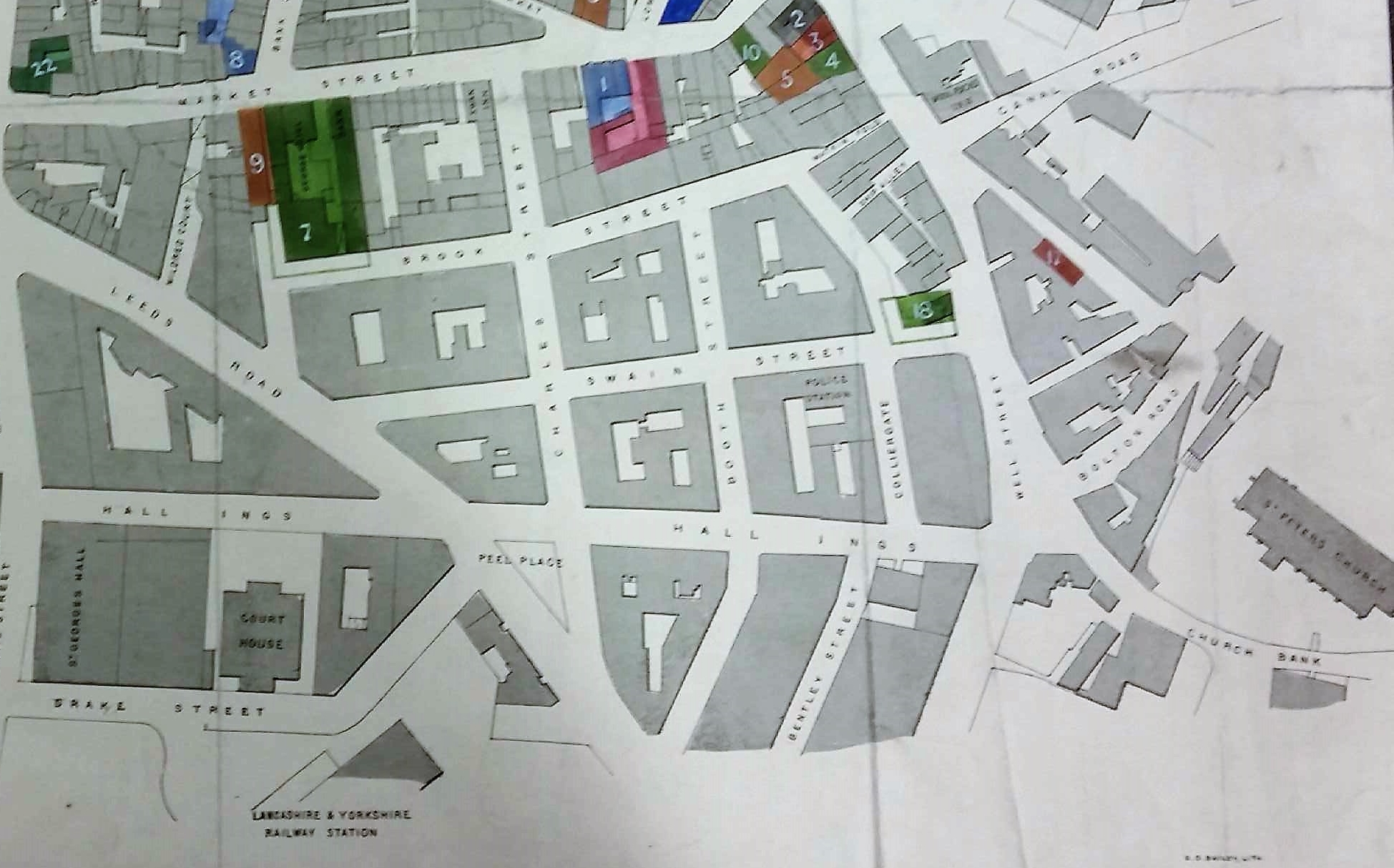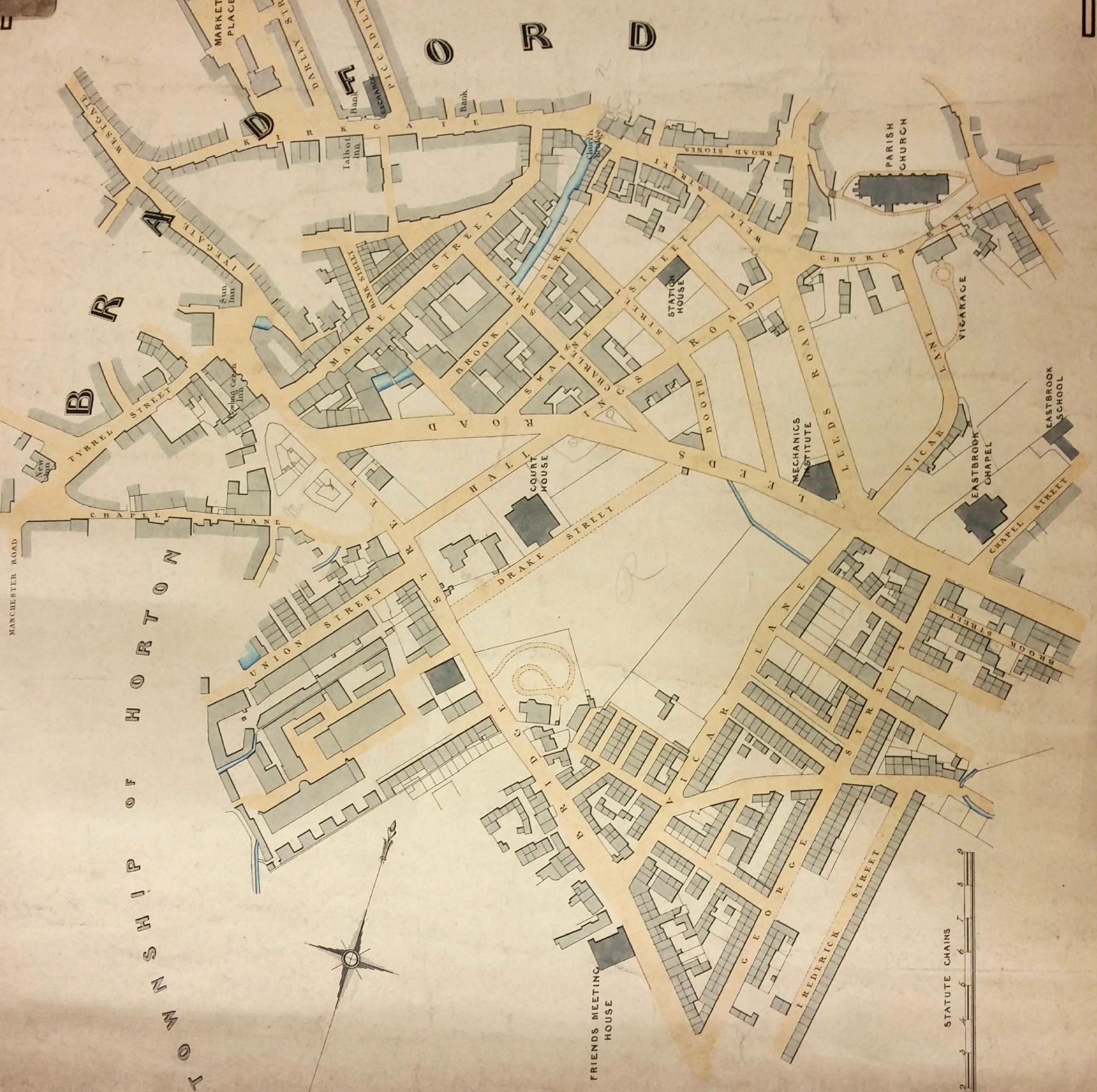 I have to confess that I had never heard of this building until I reviewed the first map from the Bradford Local Studies Library reserve collection. The Court House is placed virtually in its centre between Hall Ings and Drake Street. To its south-west there are a cluster of buildings that clearly must have been demolished when St George’s Hall, currently occupying the site, was constructed. In fact these two buildings help to date the map. William Scruton in Pen & Pencil Pictures of Old Bradford gives 1834 as being the year that the Court House was opened. St George’s Hall was erected in 1850. We can tighten things up a little since the Mechanics Institute, also shown, would not have been present before 1837. But the Swaine Street Station House (a fire and police HQ) was, I believed, opened around 1847. Essentially then the first map shows Bradford just after it became a borough in 1847.