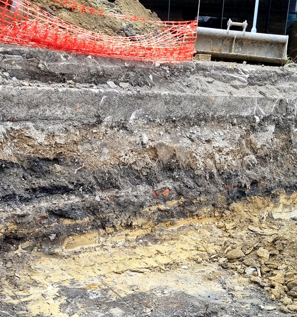I don’t normally put much archaeology in these articles but here I shall make an exception. Recently a mechanical digger had cut a very convenient section in from of the T&A building of which this is a photograph. Under the orange net there seem to be two modern surfaces of concrete or stone. At the bottom is the yellow ochre colour of glacial drift deposit. Between the two, a distance of not much more than half a metre, are two distinct soil horizons with minimal brick and coal debris. It would not appear that any substantial construction predated the T&A building on this site.