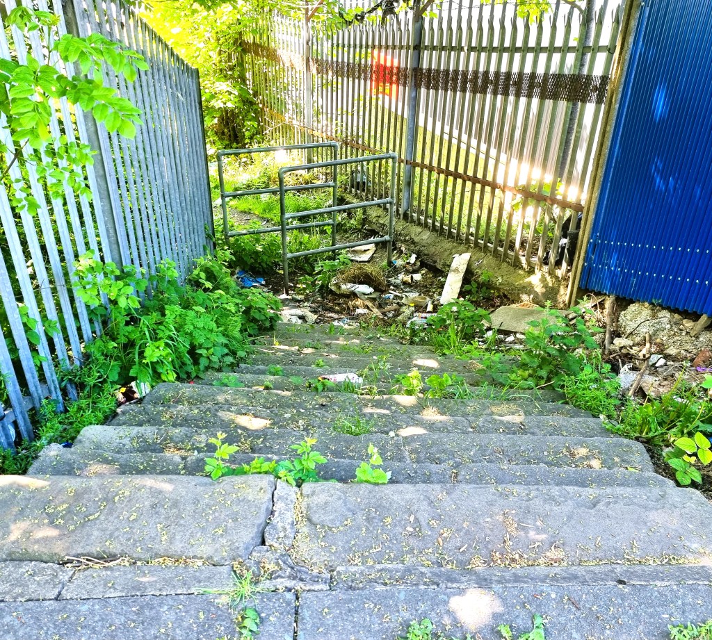 After this success things start to get difficult: Ripley Street is truncated by a huge works, although aerial photography suggests that one of the three reservoirs here has survived. This section of ‘New Hey Road’ on the map is now called Bowling Park Drive. The park is on your left: to the right the dye works and the streets to the north of it have vanished and the site is covered by industrial development. On the ground you can progress a little further north than the mapped park lodge and Hall Lane and then, just before you reach the junction between Bowling Park Drive and Bowling Hall Road, there is a mysterious flight of steps to the left.