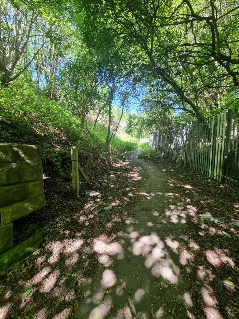 Take care if you descend since there is no hand-rail. The steps lead to a footpath paved with stone setts. The path is present on the OS map, running east-west immediately above the words ‘Bowling Dye Works’. At the bottom of this path are very high stone walls which I assume were once the perimeter wall of the works. Finally, you reach the curve of the Great Northern track from Bowling Junction to Laisterdyke. The track no longer exists but the line is visible on aerial photographs such as those provided by Google Earth. I assume the line was on the embankment now covered in trees. A right turn is blocked by security fencing but a left turn takes you along a paved footpath which shortly joins another section of Ripley Road.
