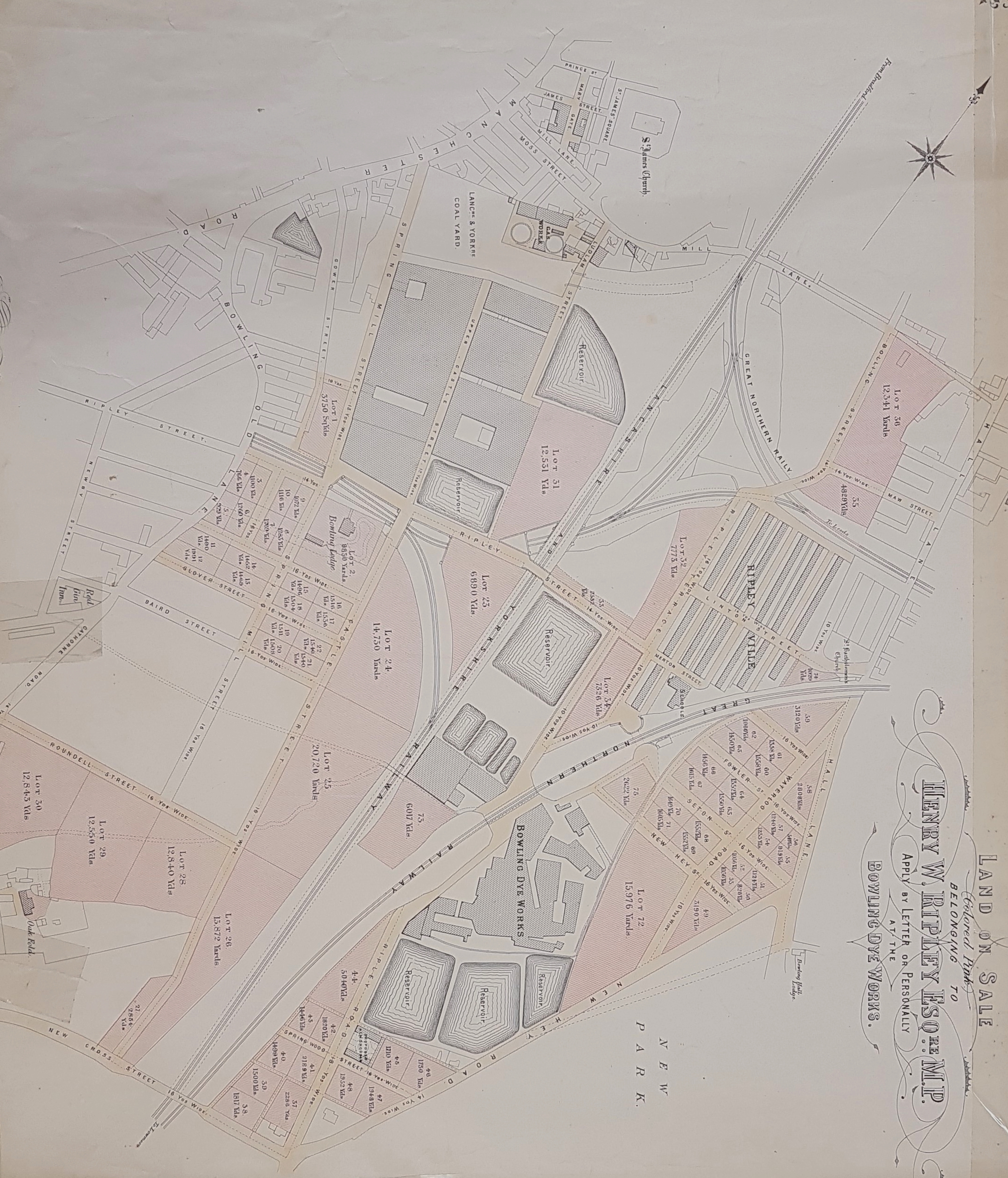 The second map is more useful and should be turned 45 degrees anticlockwise to align it with the OS map. There has been considerable urban development and the arrangement of streets resembles the modern more closely. Henry W Ripley is selling portions of land and must have been alive at the time of the sale. He died in 1882 but the map is at least a few years earlier since he is not using the title of baronet which he received in 1880. The existence of a ‘new park’ isn’t useful as dating evidence since Bowling Park was also opened in 1880. A date of approximately a generation after the OS map would seem reasonable.