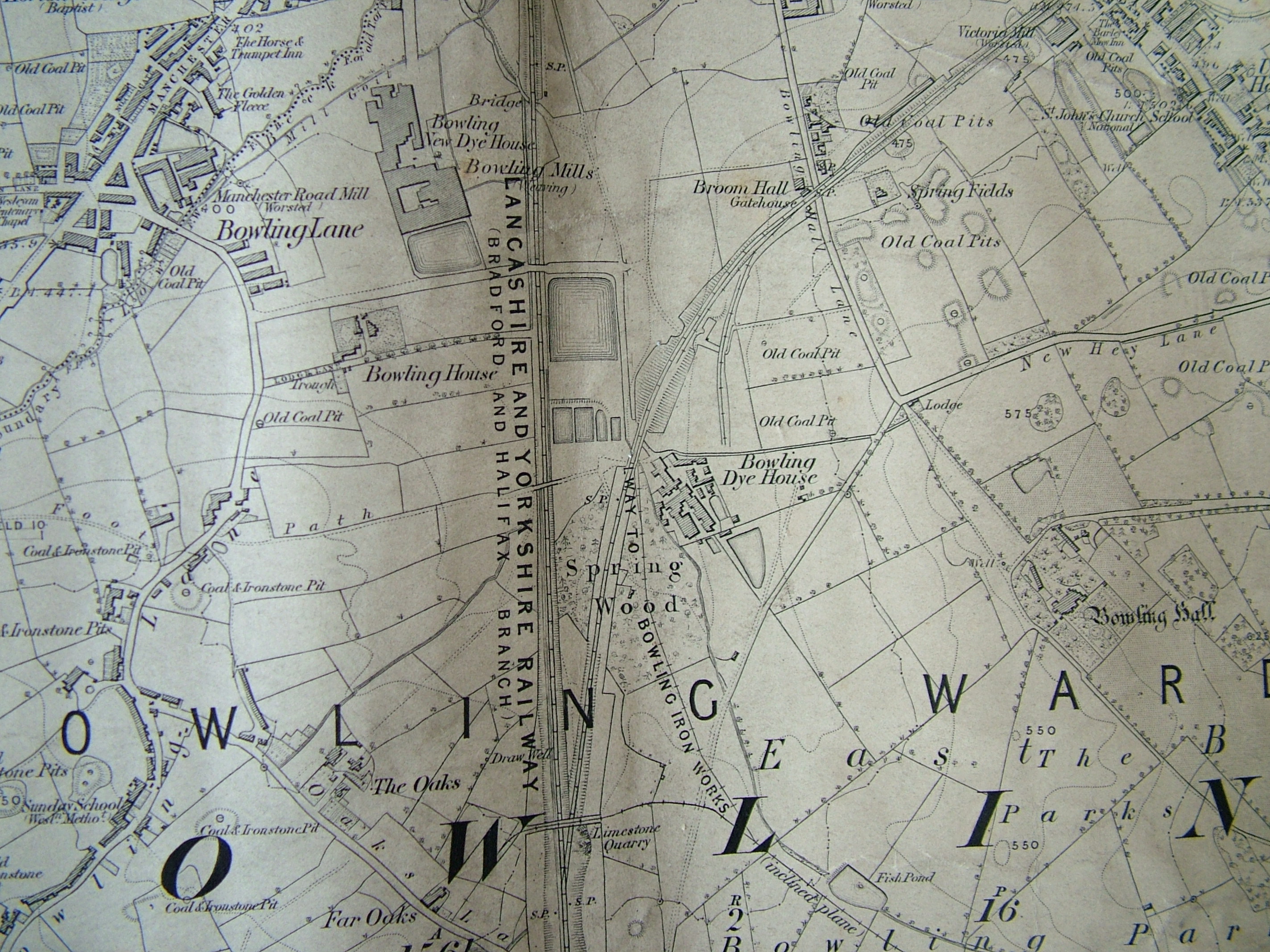 A ‘limestone quarry’ is indicated. Limestone strata do not reach the surface in the city area but there was nonetheless an early lime-burning industry based on the extraction of boulders from glacial moraines.  In this case the digging of a railway cutting presumably exposed the valuable mineral. Plausibly these boulders were taken to the nearby Bowling Iron Company where crushed lime was used as a flux in iron smelting. The ‘railway to Bowling Iron Works’ was a tramway or mineral line along which coal was transported. Note the number of coal pits surveyed. North-east of the junction is Spring Wood. The name has almost certainly nothing whatever to do with a water supply. ‘Spring’ was applied to a tree that had been cut off at ground level for coppicing. Spring Wood was presumably an area of old coppice woodland. William Cudworth records that there was once also a Springwood Coal Pit, but the wood itself soon disappears from maps. ‘The Oaks’ and ‘Far Oaks’ are also reminders of a sylvian past.