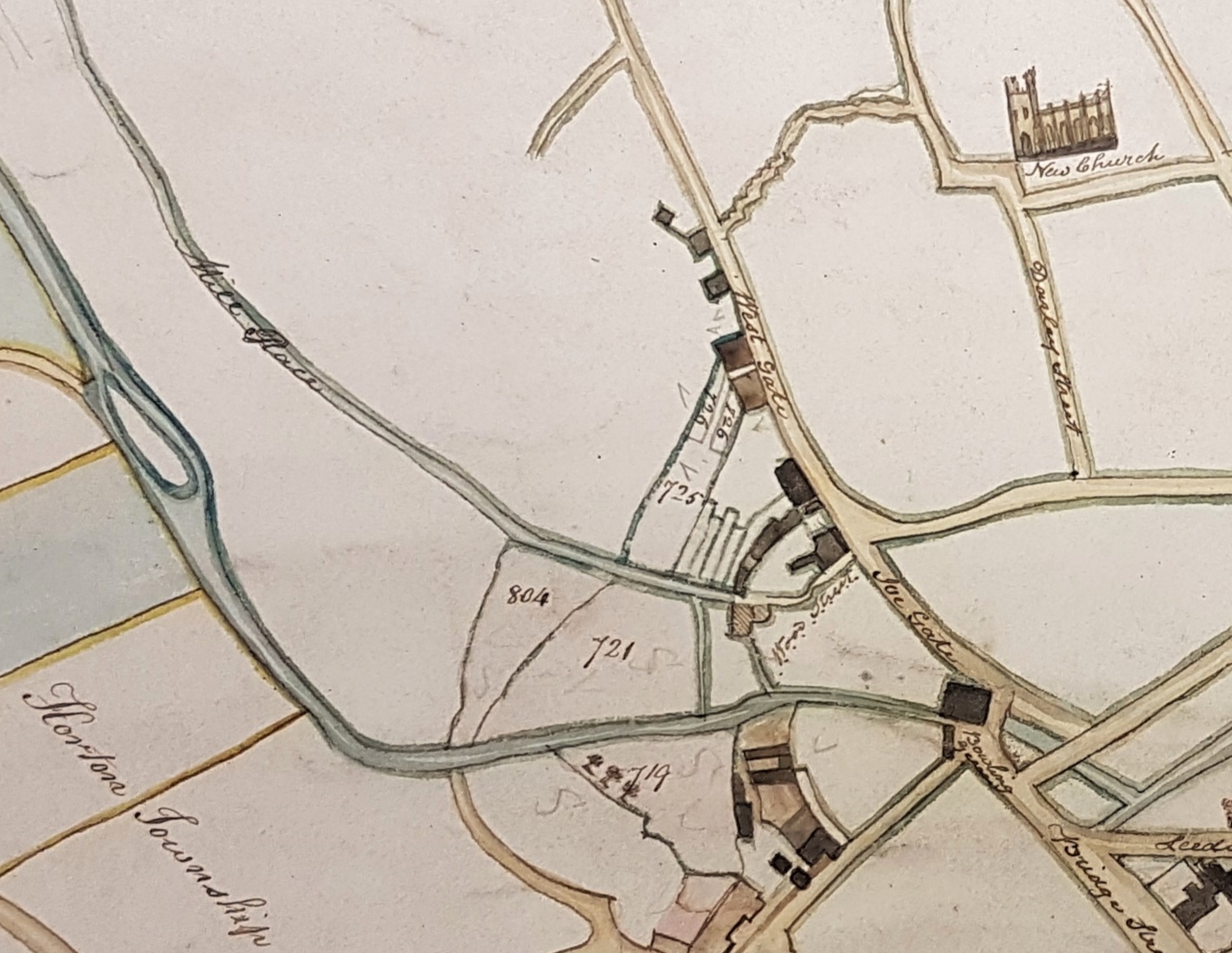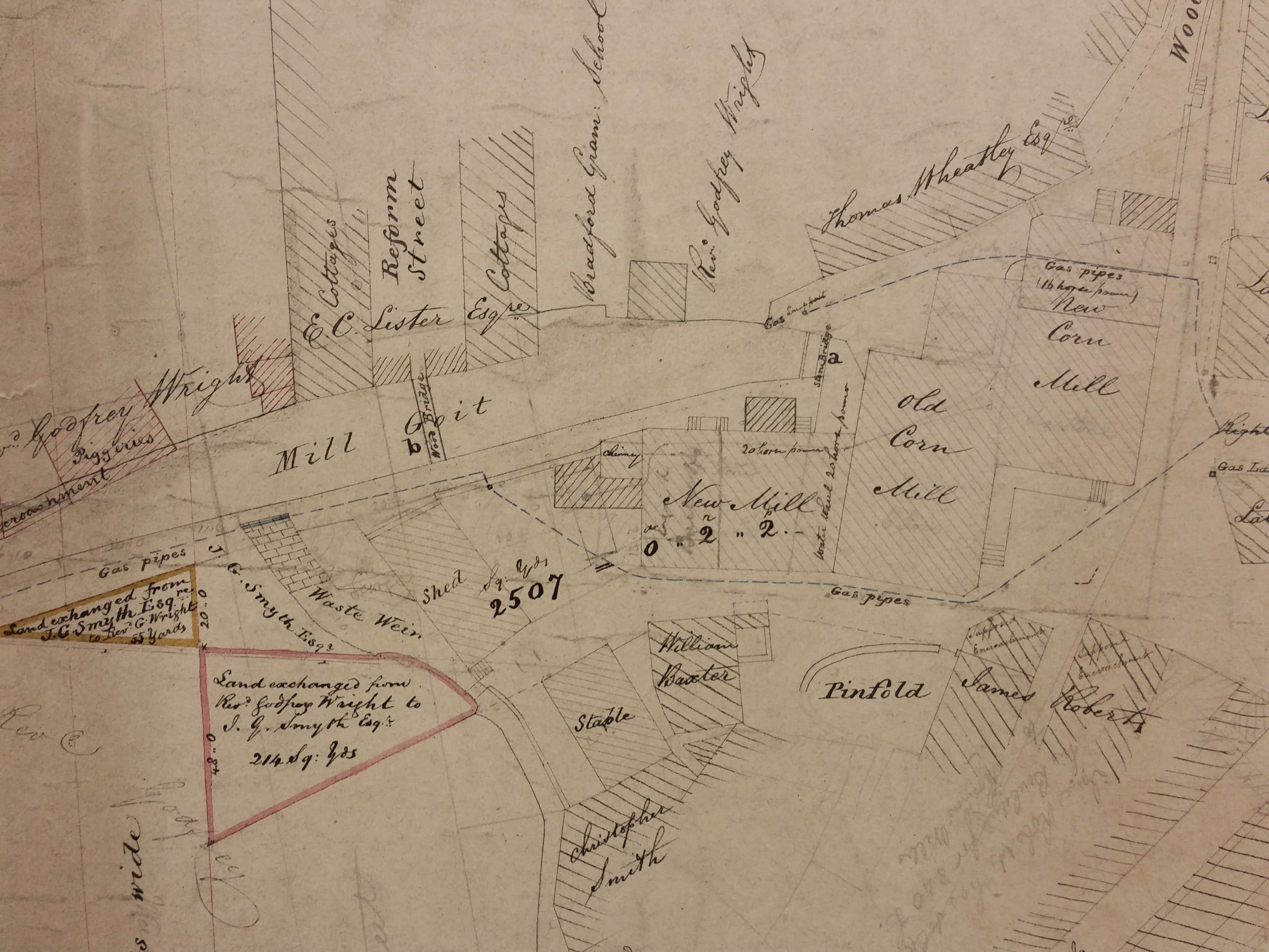 The final detail shows the complex land ownership situation around the Soke Mill. The land referred to as belonging to Godfrey Wright is present at the top centre of this plan. His holdings get several other mentions as you can see. The plan is a bizarre combination of the old and the new. There is a ‘pinfold’ for stray animals, and there are piggeries. The new Bradford is represented by gas pipes. I will return to attempt to analyse the development in this area in another series of maps.