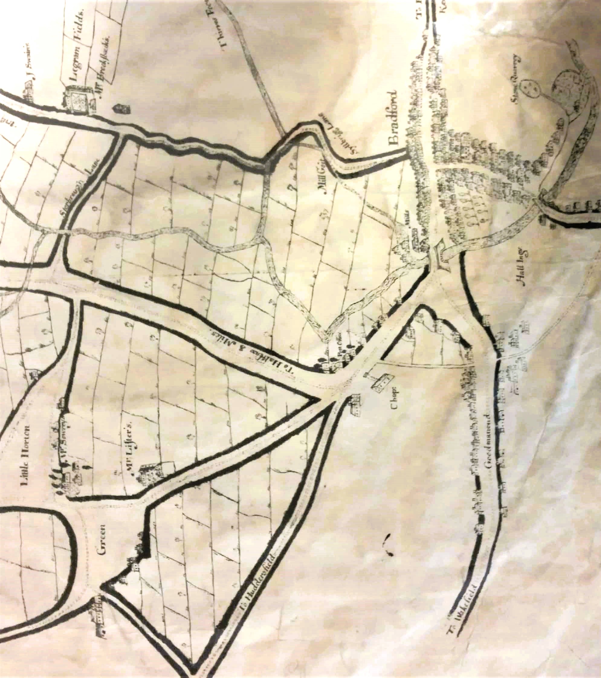 This map is in the permanent collection of the Bradford Local Studies Library, and is catalogued as BRA 1722 BRA (reprint). The original was part of the Hailstone Bequest to the Dean and Chapter of York Minster but is apparently now missing. Copies have clearly been made and one was kindly brought to my attention by a Saltaire Collection volunteer, Jo Singh. Doubts have been expressed as to the authenticity of the original, but my own feeling is that, within certain limitations, it is as reliable as any other contemporary plan: not that there are many of those. The Bradford & Horton map was unpublished until it appeared in a 1931 edition of The Bradford Antiquary (Vol.7), written by its then editor, J Hambley Rowe. It is clear that Rowe accepted the map as genuine, and he spent a great deal of his article matching places mentioned in 1722 with those he recognised in Horton two centuries later.