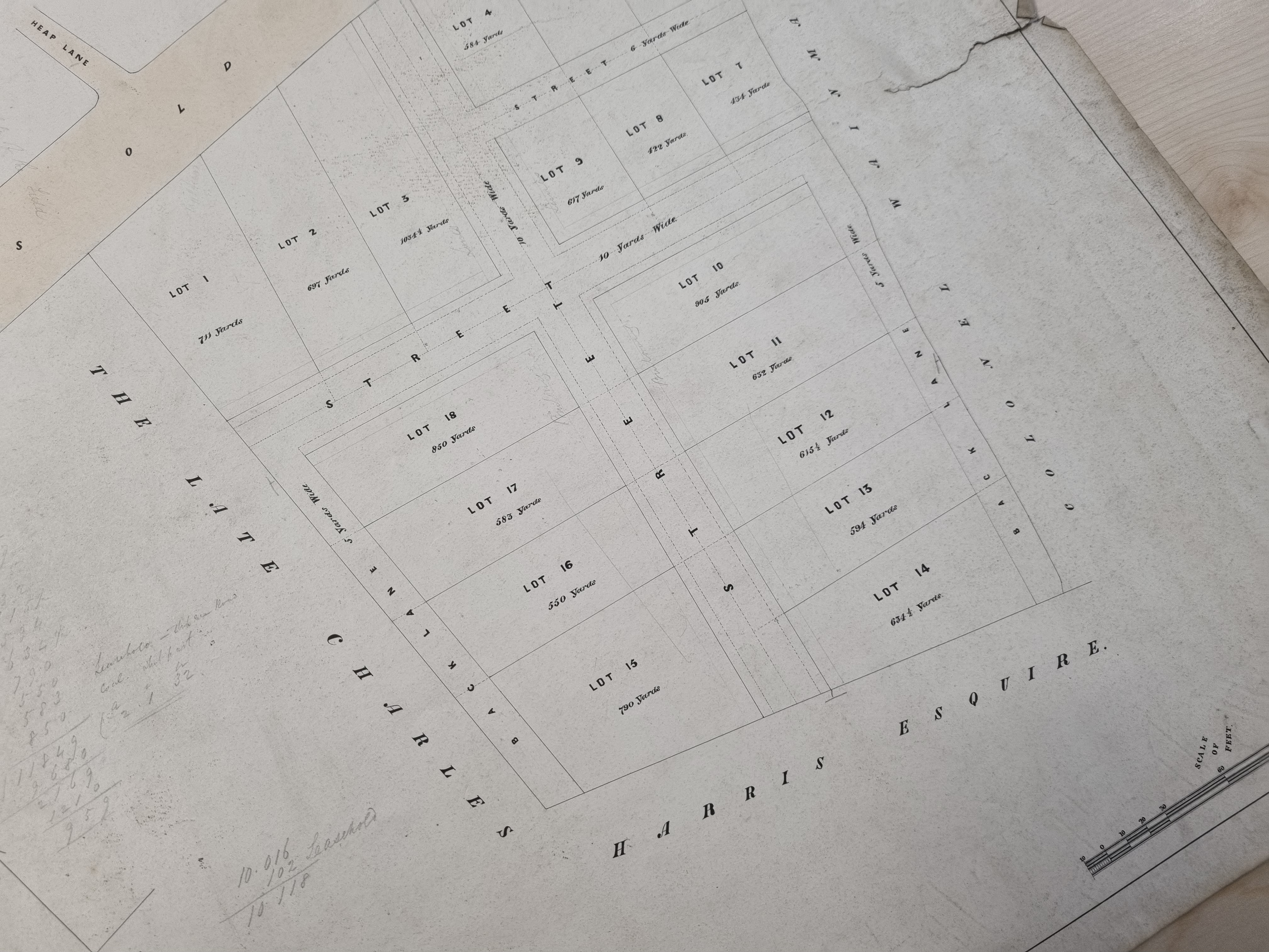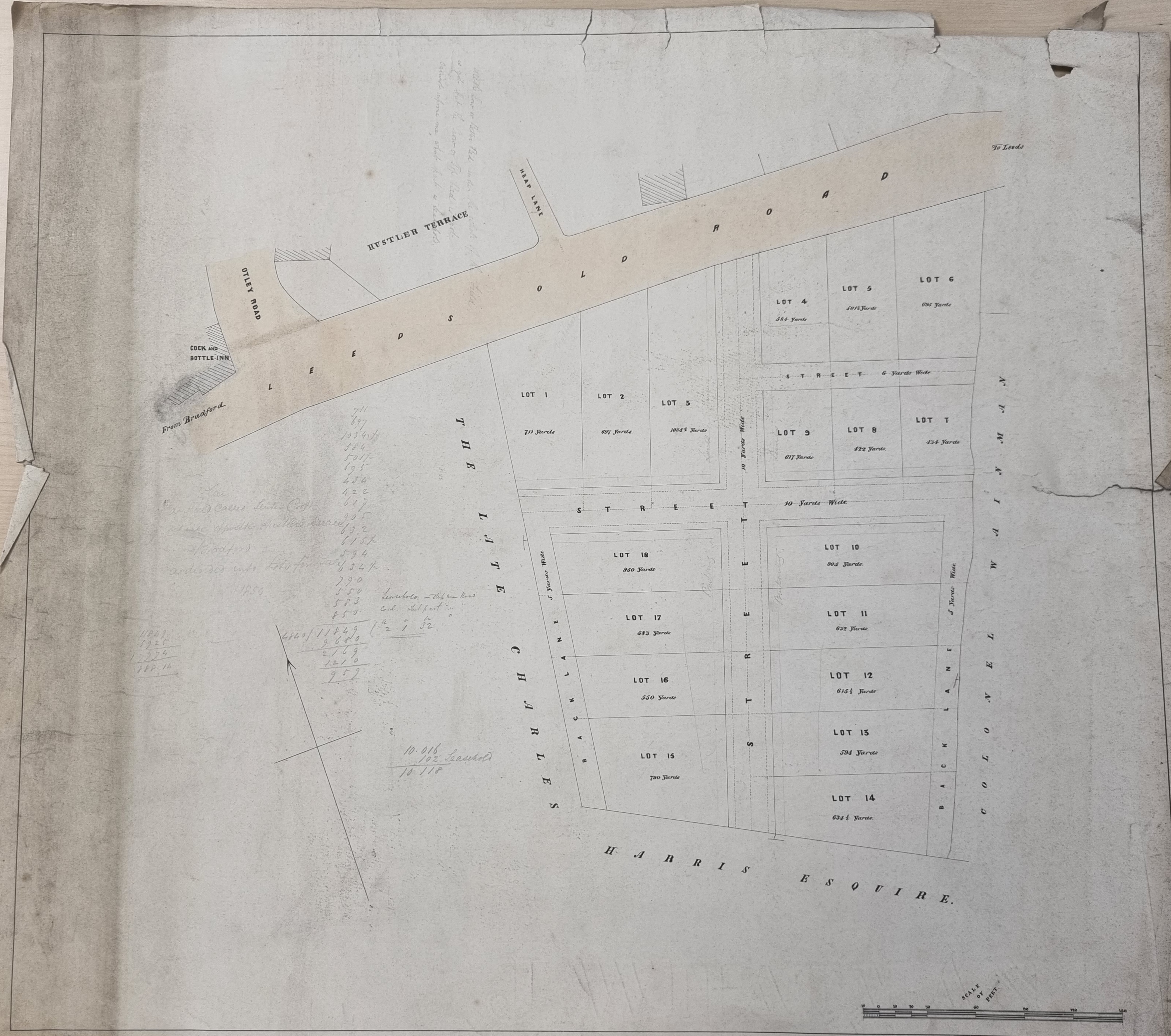 Helpfully this plan is annotated on the back ‘53. Plan of Hustlers Field, Leeds Old Road’. The location can be identified exactly since Otley Rd, Heap Lane and the Cock & Bottle Inn are drawn. We are dealing with the sale, or auction, of building plots on land that was once the site of the Bradford Union Workhouse grounds, south of what is now called Barkerend Road.