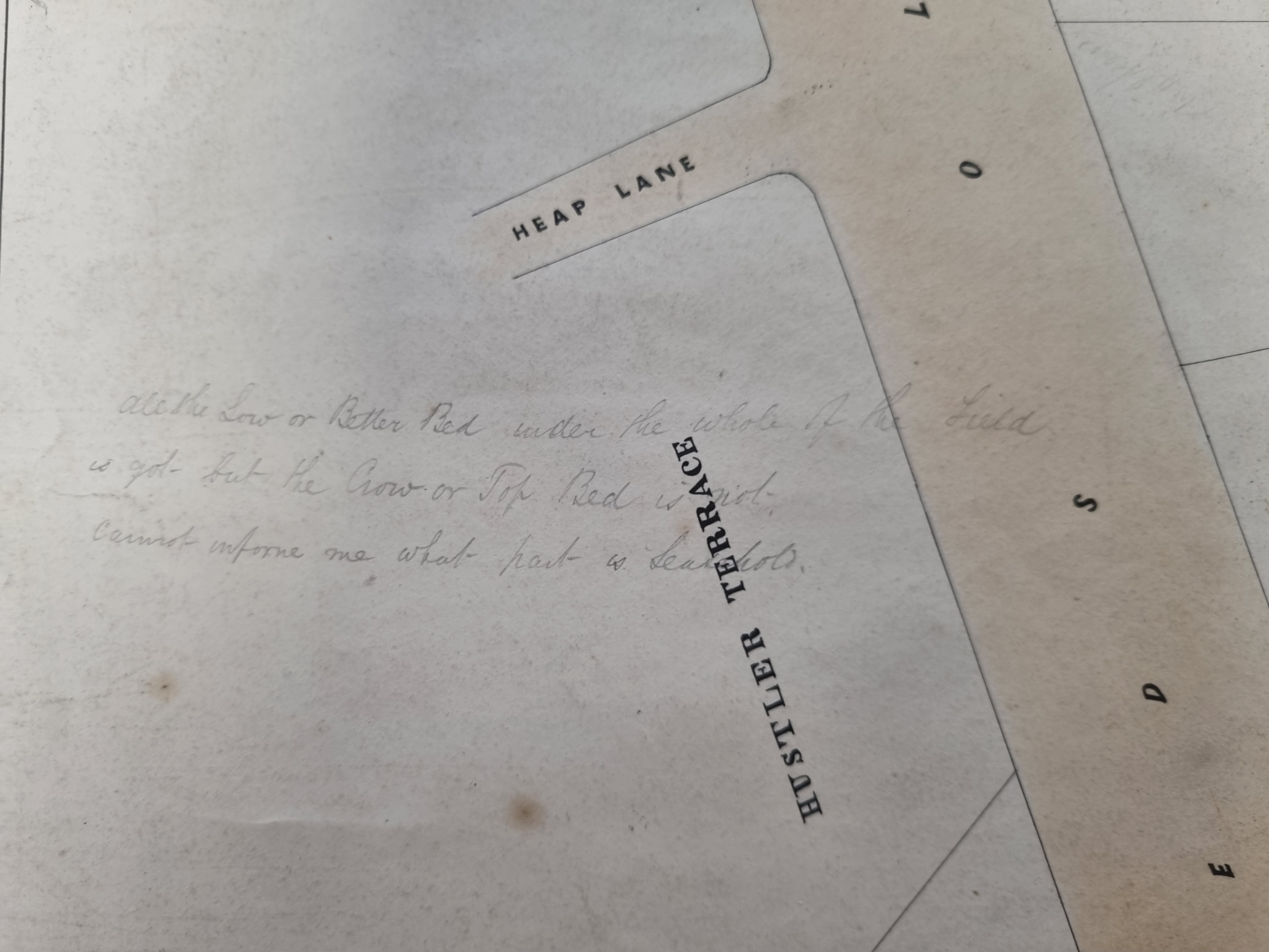 There are many pencil annotations. One reads ‘all the Low or Better Bed under the whole of the field is got but the Crow or Top Bed is not. Cannot inform me what part is leasehold’. This clearly refers to coal mining in the area. The Better Bed (highly prized as coking coal) retains its name: I assume the ‘Crow Coal’ or ‘Top Bed’ is the modern Black Bed coal seam famous for its iron stone content, exploited at Bowling and Low Moor. There is a seam called the Crow Coal in south Bradford too, but the term seems to be applied to the coal nearest the surface in many regions.