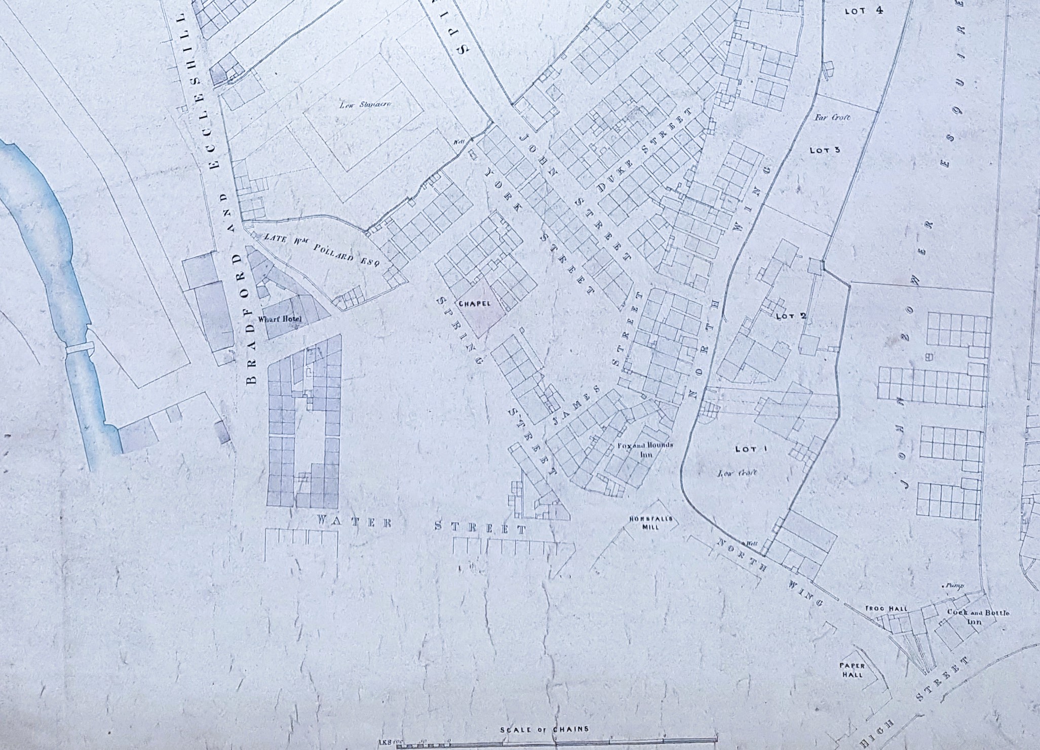The next vital event in the development of Bradford as a wool textile centre was the invention of the power loom. It is generally believed that the first one to be installed in the town was at the premises of JG Horsfall in North Wing in that same year of 1825. The location of this mill can be seen on the first map detail, near the bottom centre. The mill was subsequently attacked by desperate unemployed workers from Fairweather Green. The riot act was read, armed forces fired on the crowd killing two people, and others were arrested. Further episodes of machine breaking followed.
