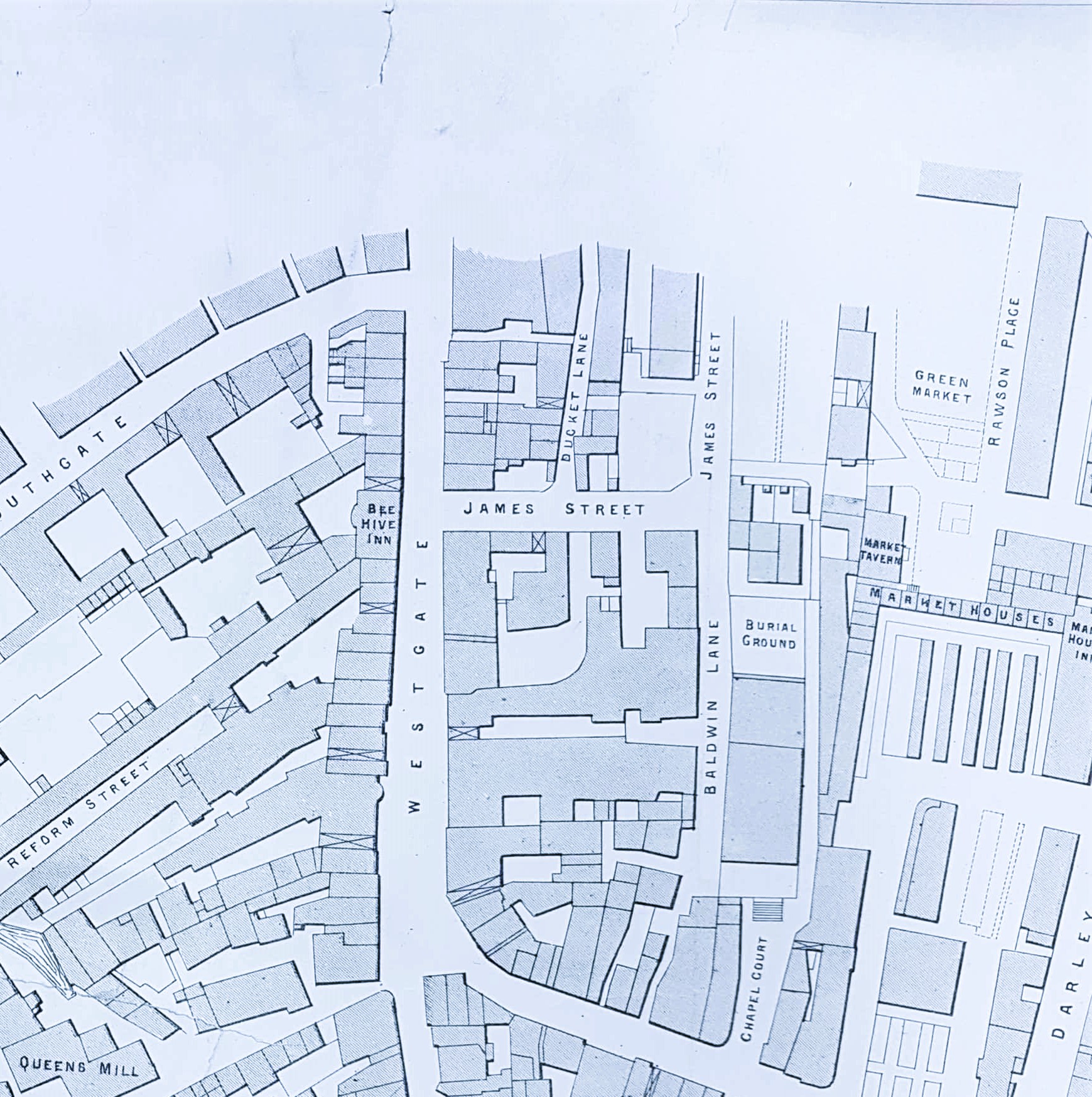 Two earlier episodes, in 1825 and 1840, were of almost equal importance to the events at Lister’s Mill. I have tried to locate them ‘on the ground’ with contemporary maps from the Bradford Local Studies Library reserve collection. My main source of information has been Bradford Chartism 1838-1840 by A J Peacock (1969, Borthwick Institute). Of course, the city has changed utterly since the mid-nineteenth century and it is not easy for us to place long vanished buildings on modern streets. My intention, in any case, is to use the buildings as a means of examining the aspirations of those who once used them. The Bradford citizens involved in these events deserve much better than oblivion.