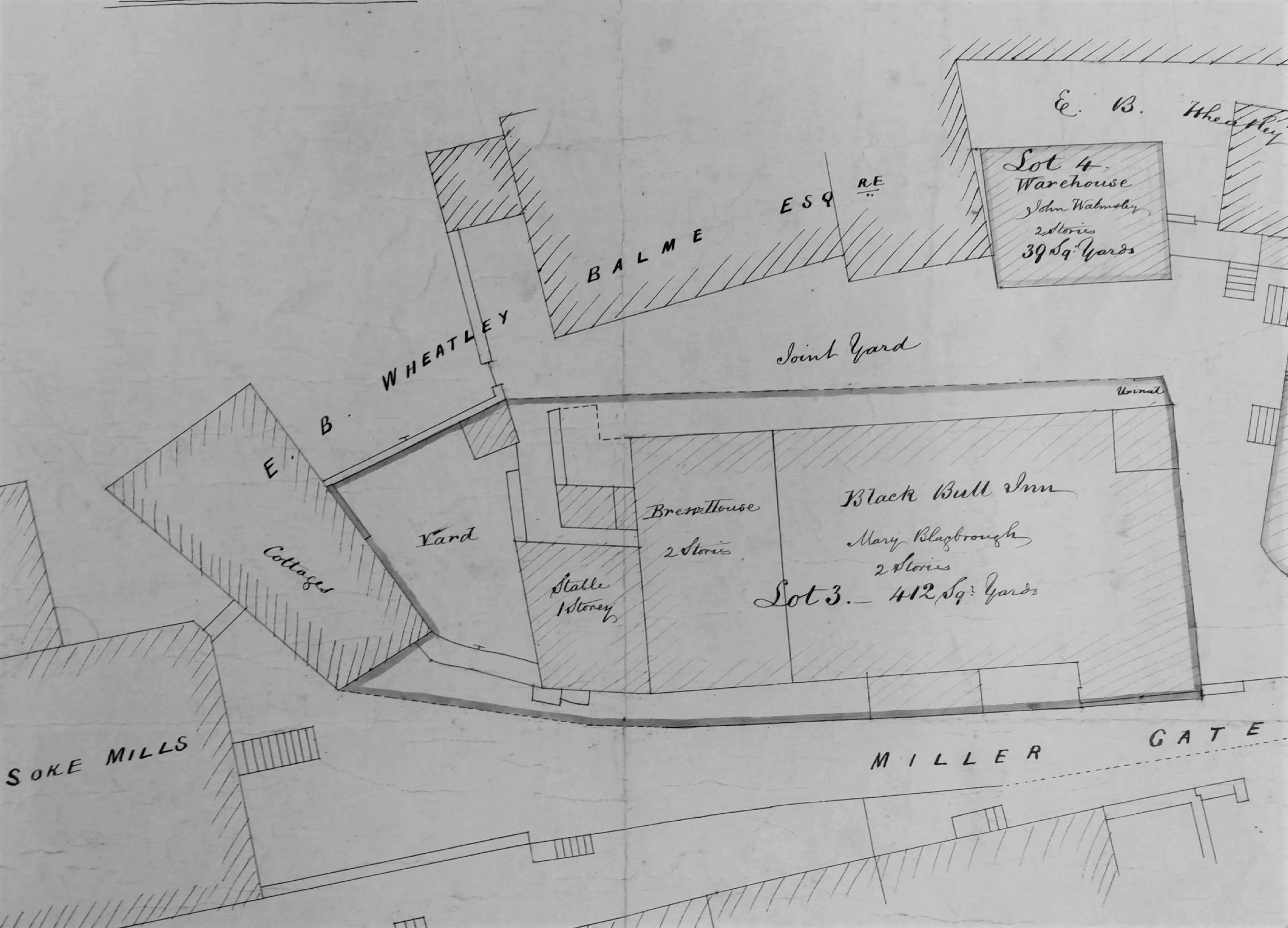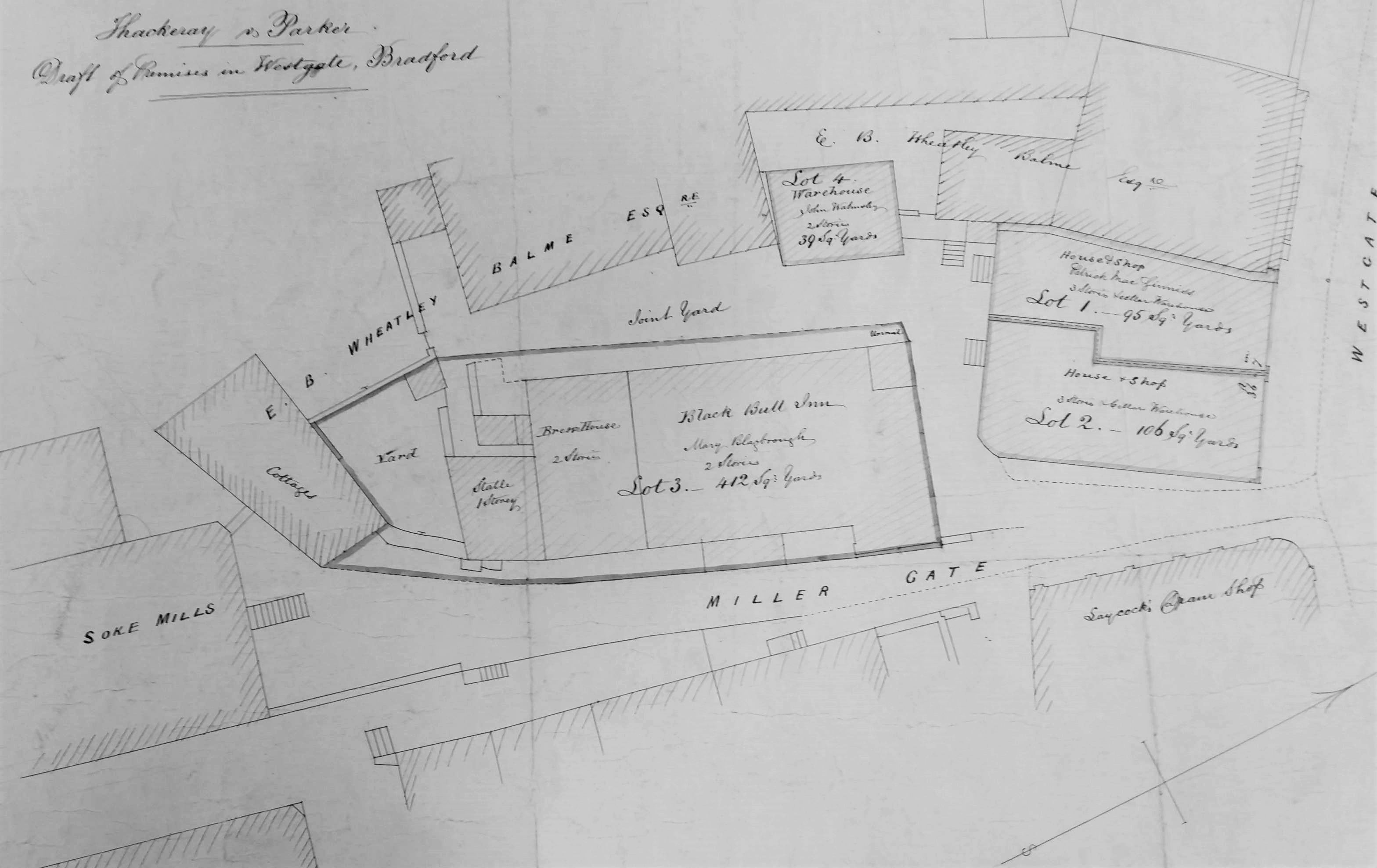 This is a detail of the first plan which is undated. It is entitled Thackery v Parker, although I know nothing more about this case. What we have is a 4-lot auction plan showing the Black Bull Inn, Millergate and the surrounding premises. Clearly the inn is the focus of the map. As well as a bar area there is a brewhouse, stable, and urinal. A highly civilised operation then but perhaps not one for refined ladies. The frontage is on Miller Gate of course and there is a yard behind.