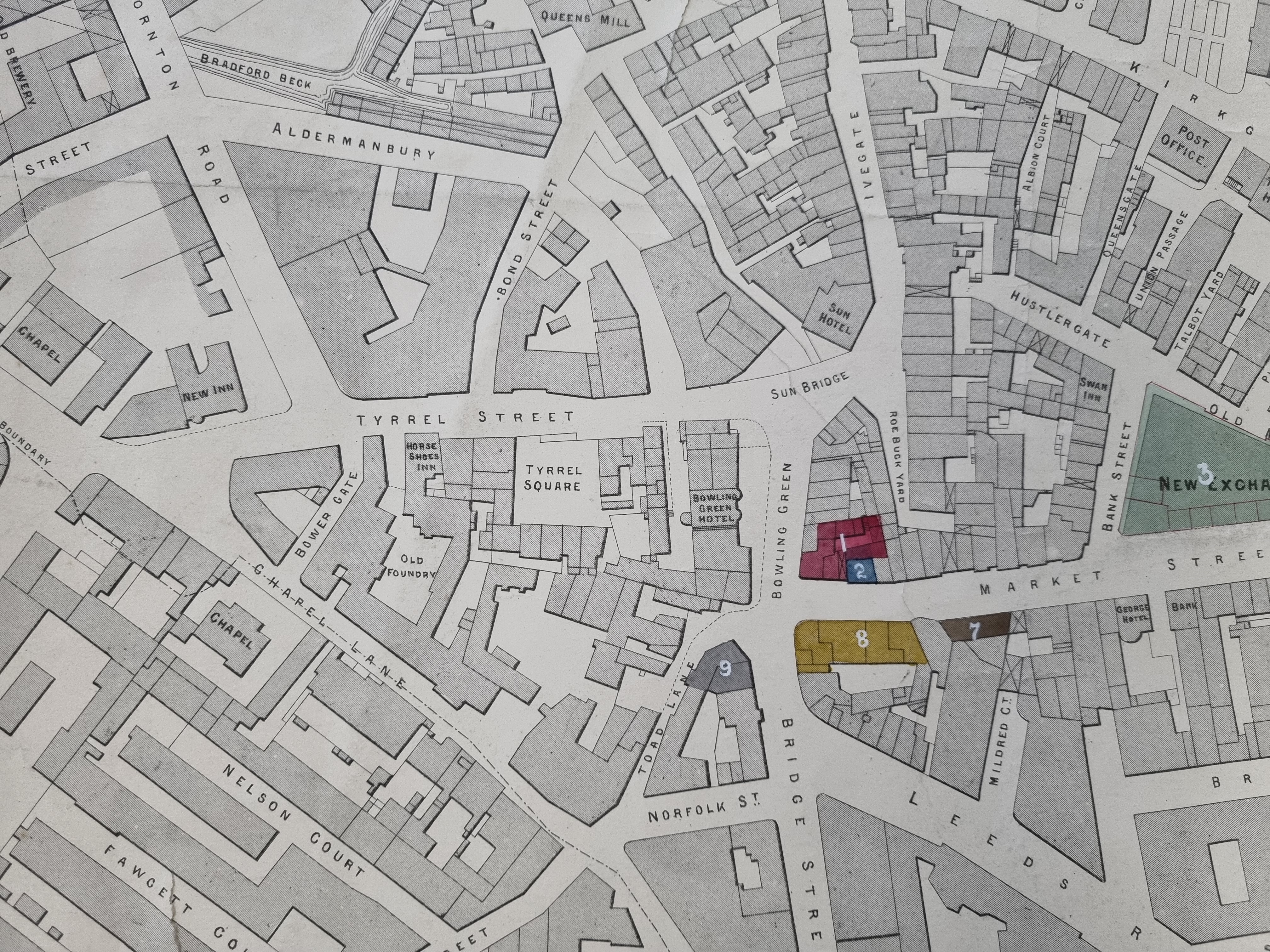 Neither plan shows the Town Hall which places them both earlier than 1873. The new Wool Exchange (now Waterstones) is missing from the first plan too which puts it earlier than 1864-67. If you look closely, some of the changes made to Bradford in the first plan feature as interrupted lines in the second. Anyway, you can see Toad Lane running between the end of Norfolk Street and the Bowling Green. I’m always surprised that there was an Old Foundry (Cliff’s Foundry) quite so near the centre of Bradford. There are a considerable number of inns, but this is understandable since many businessmen without permanent premises of their own would use them for commercial transactions.