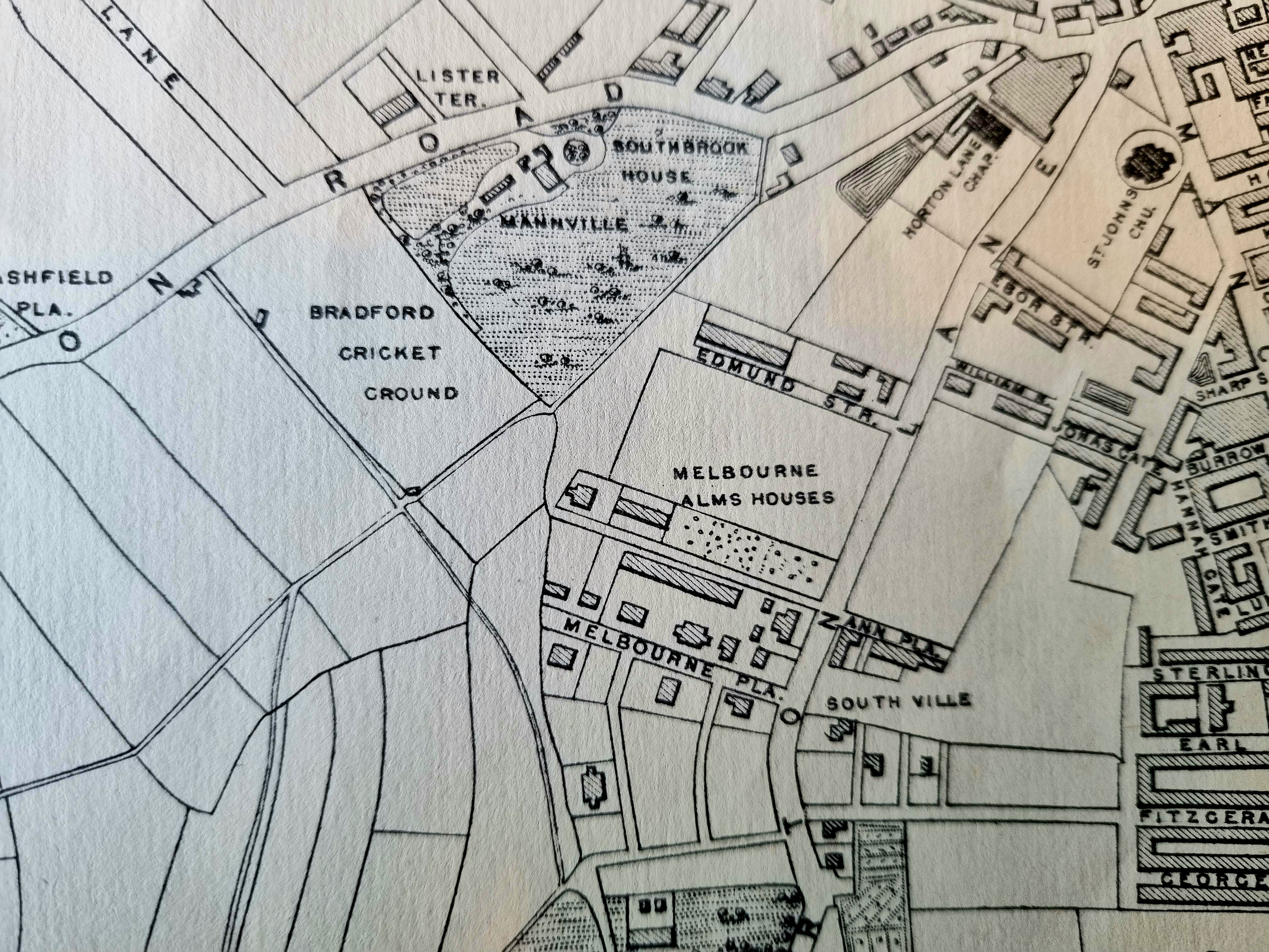 Reaching further back it is clear that a decade has brought about a very substantial change, The Apkin plan of Bradford dates from the 1850s. The area is scarcely developed at all and there is neither parsonage, chapel nor school. North of Melbourne Place are the Melbourne Arms Houses. I gather that these survived at least until 1873 but further information has been difficult to come by. The area would, in any case, soon be covered by terraced housing. At the bottom centre of the map is the garden of Horton House extending down towards the city.