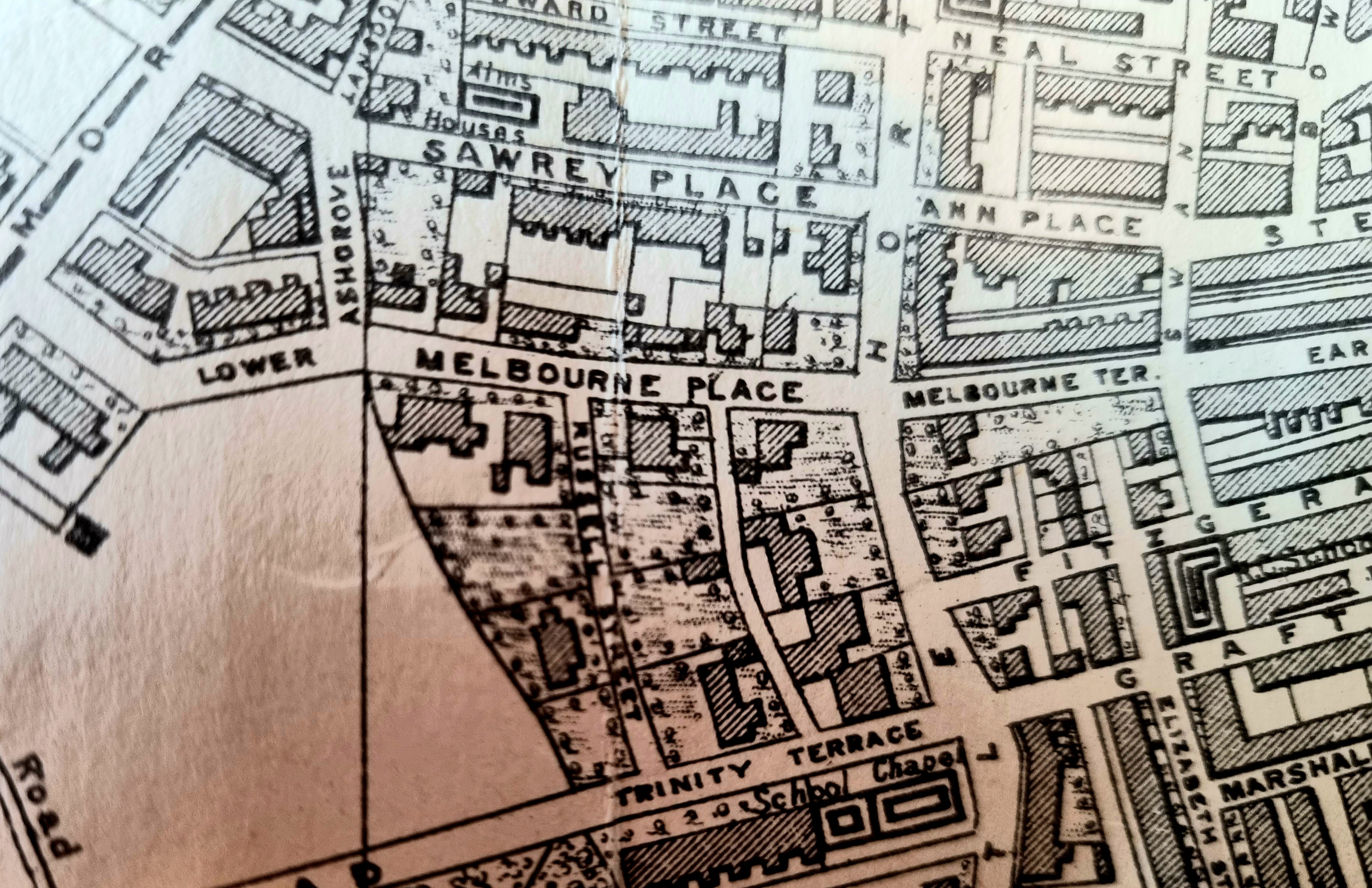 I was told that the film club has been in existence since 1932. The first map detail is from the William Byles map of the city centre, dated 1912. There were then some slight differences in the street names. In the early twentieth century, the adjacent thoroughfares were called Melbourne Place and Trinity Terrace, and they were linked by Russell Street. The clubhouse or stable is present at that date, but there is a puzzle. In 1912 the building was hard up against the property boundary. Today you could certainly fit a vehicle between the building and the boundary. Most probably some additional land has been purchased since 1912, but it is just possible that the original building was demolished and rebuilt on the plot in a position to allow for better access. There has also been a small degree of house development in the last 120 years, but you can judge that for yourselves.