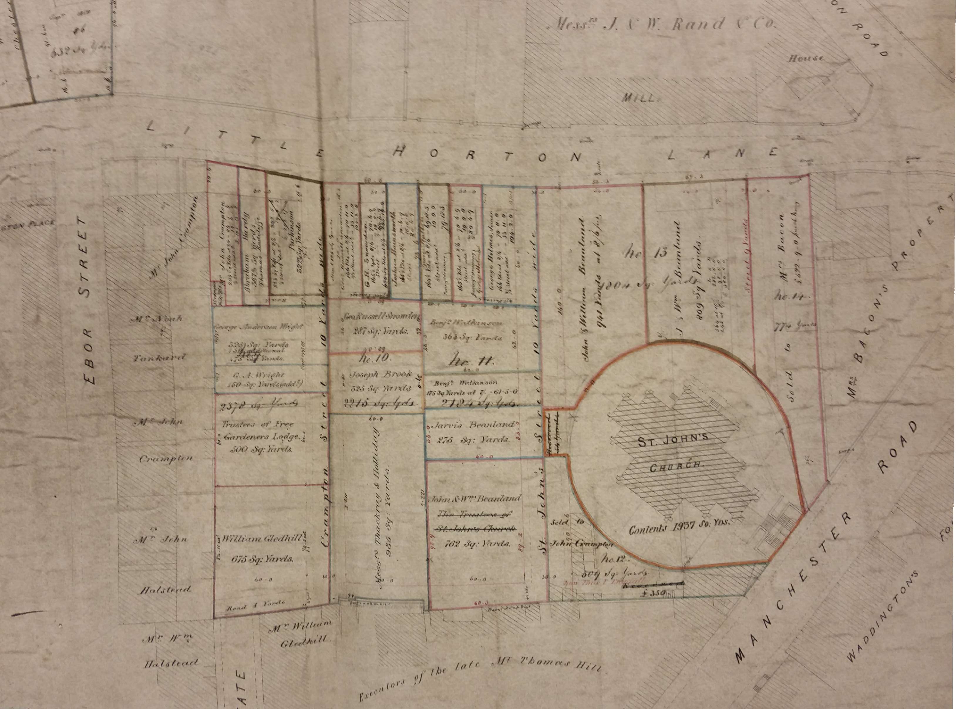 If we move backwards in time to the Bradford City map of 1871, now 150 years in the past, things are quite different. The stable is unbuilt and the plot that puzzled me in 1912 is undivided. A house opposite, with a frontage on Little Horton Lane, is marked ‘parsonage’. This indicates the residence of an Anglican clergyman. The chapel present on Trinity Terrace would not generate a ‘parsonage’. The nearest church would be St John’s, built in 1839. For various reasons it was not successful and at this time it only had another five years of existence, being demolished in 1876. The church shows well in this mid-century sale plan from the reserve collection.