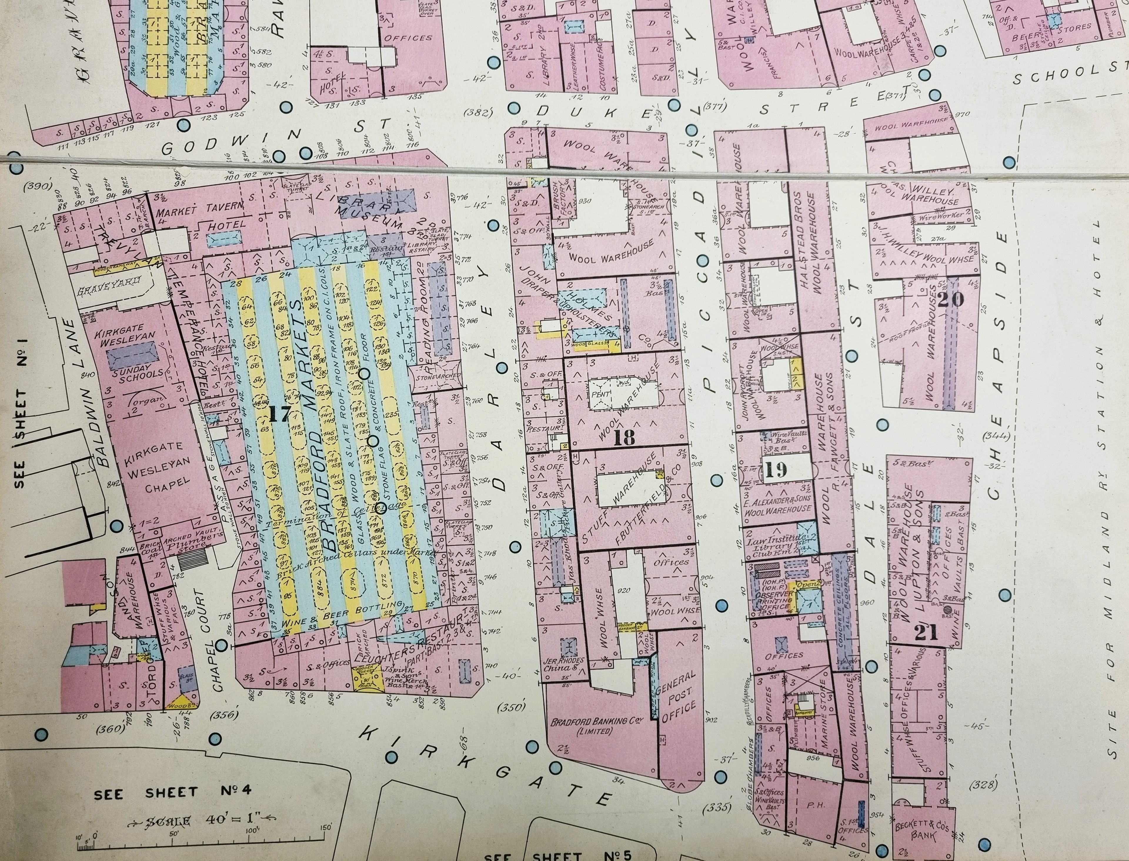 The plans would be very helpful to local and family historians since, in imagination, each property along a street can be recognised by size, shape, occupiers and neighbouring premises. As an example, the first figure shows Kirkgate, Piccadilly, Darley Street, and Godwin Street in 1929. The number of wool warehouses is not surprising but look at the details provided for Kirkgate Wesleyan Chapel with its steps, organ, graveyard and adjacent Temperance Hotel. In the same block is Leuchters Restaurant which was a very well-known place of resort in which The Barbarians Rugby Union side had been founded in 1890. At present I am more interested in the Godwin Street end of the block where the Bradford Library and Museum buildings are situated.