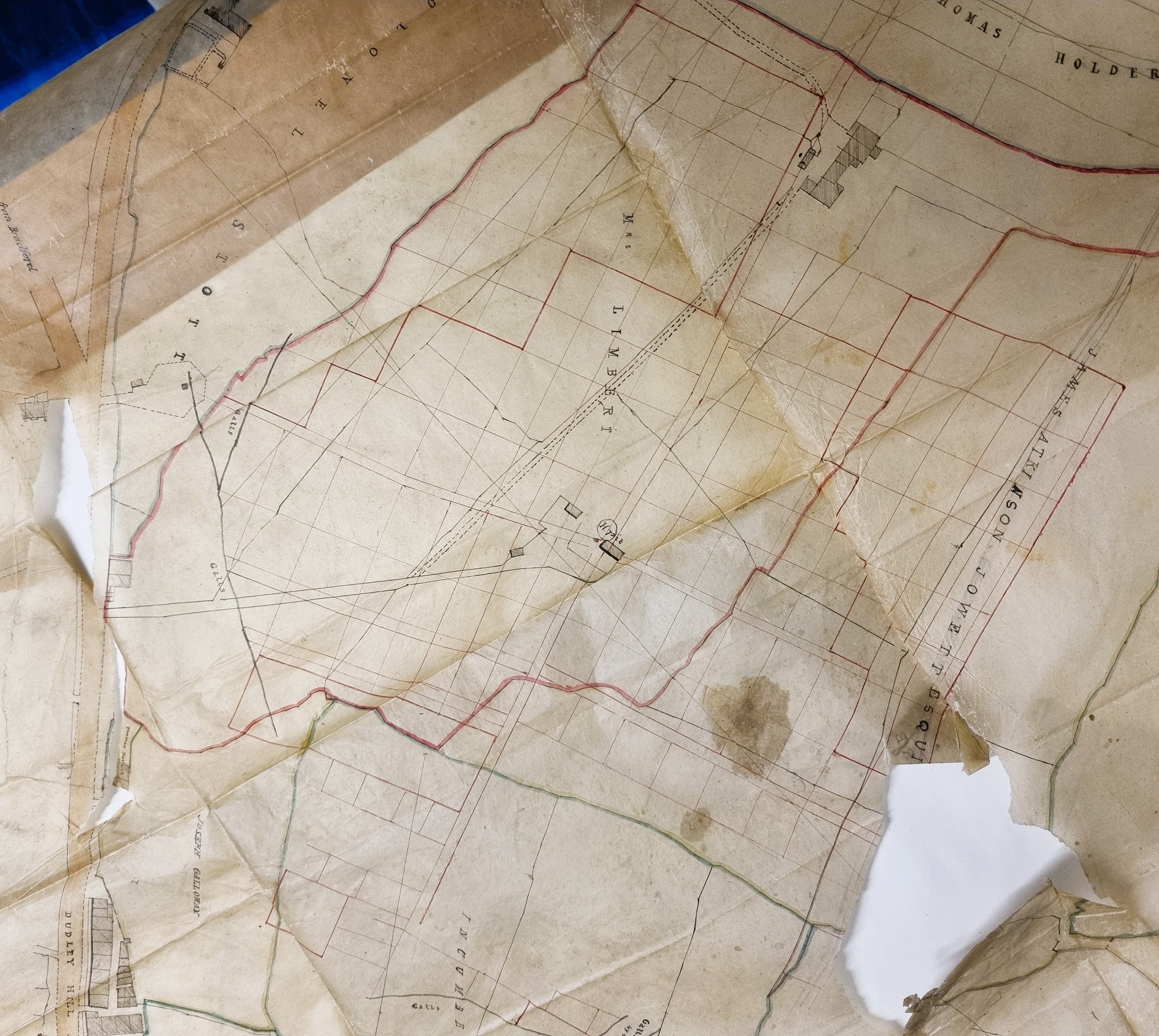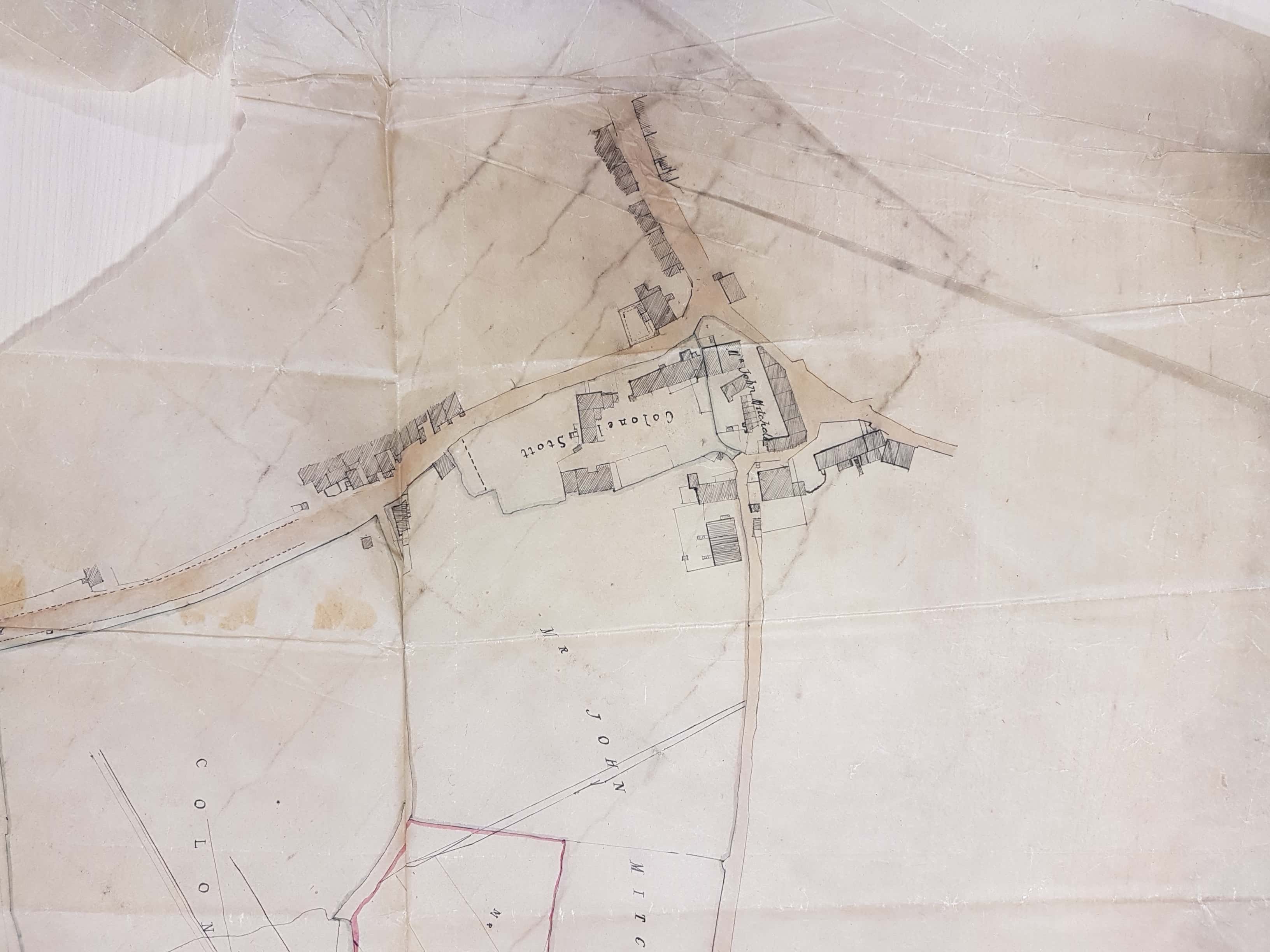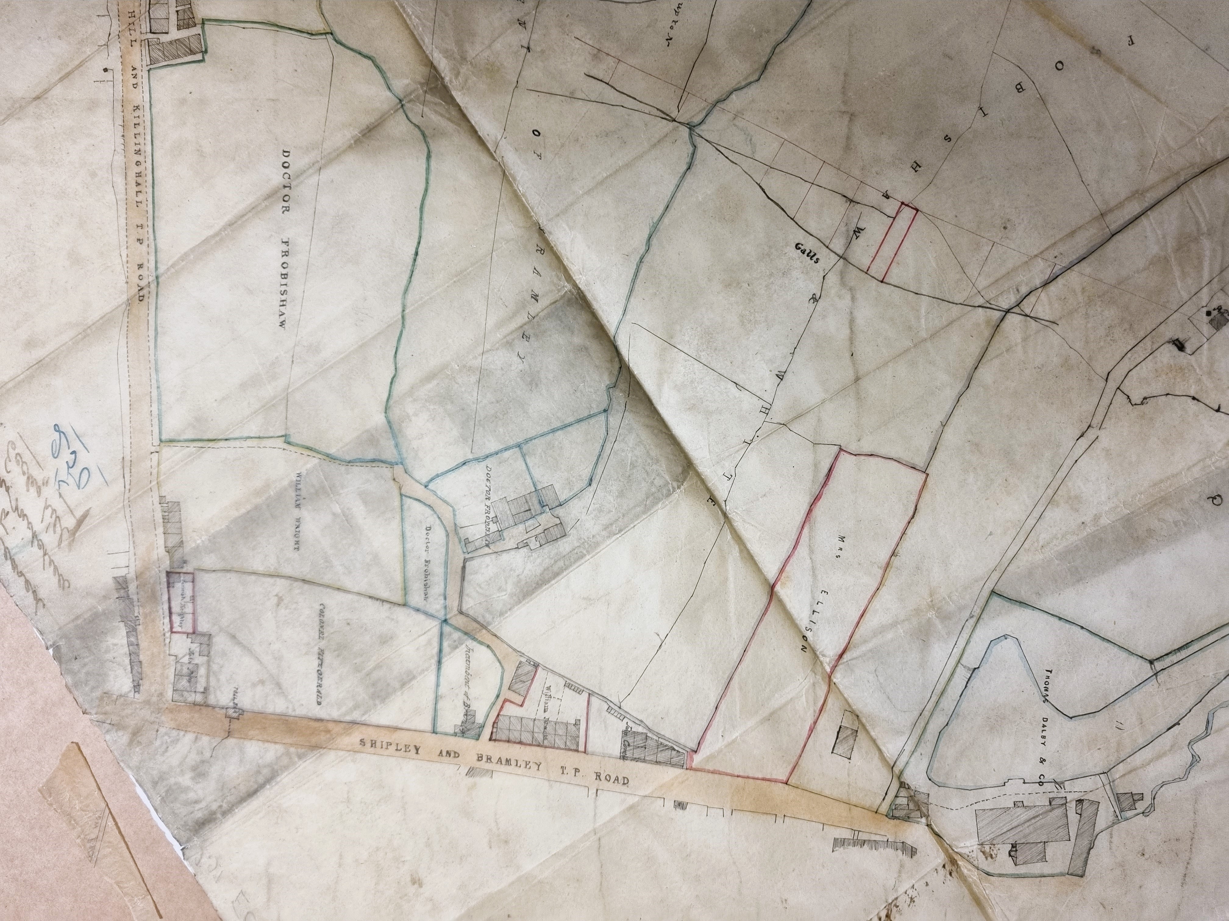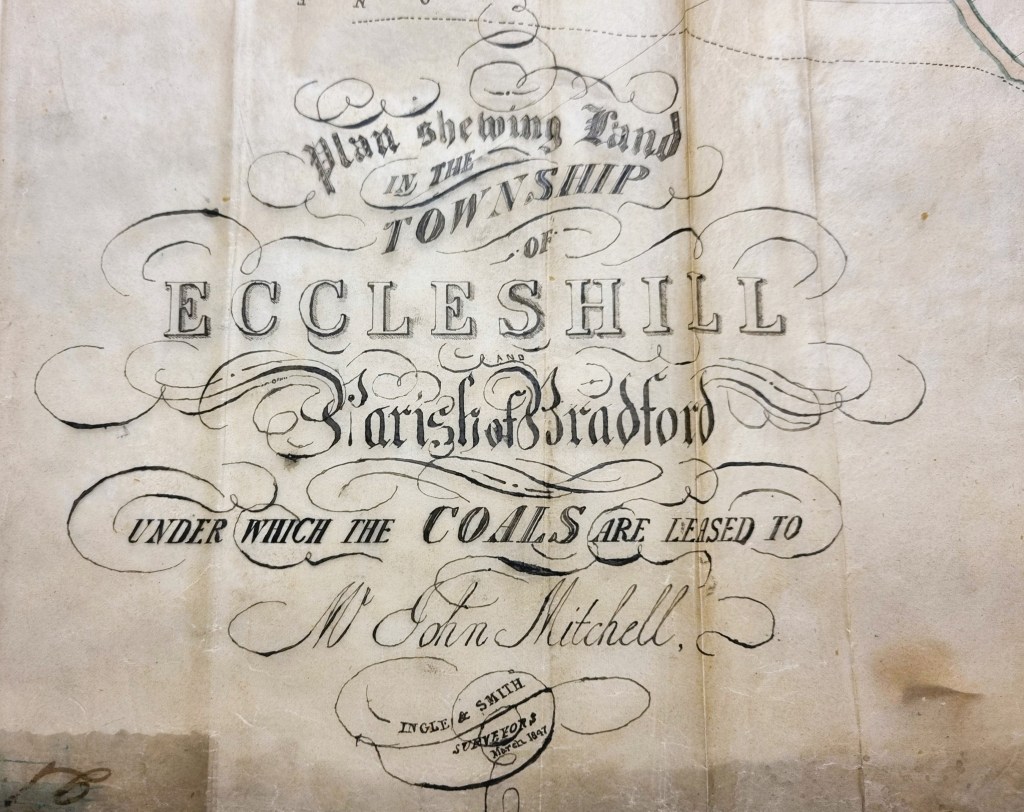 The ancient township of Eccleshill is well represented in the Local Studies Library reserve map collection, although many of its maps are in poor condition. This example is extremely fragile. It records ‘Coals leased to Mr John Mitchell’ and was drawn up by the well-known partnership of Ingle & Smith, surveyors. The condition of the map is so poor that it is not possible to record the whole map lying flat, so I have provided images of various features of interest which I have enhanced to make them more visible.