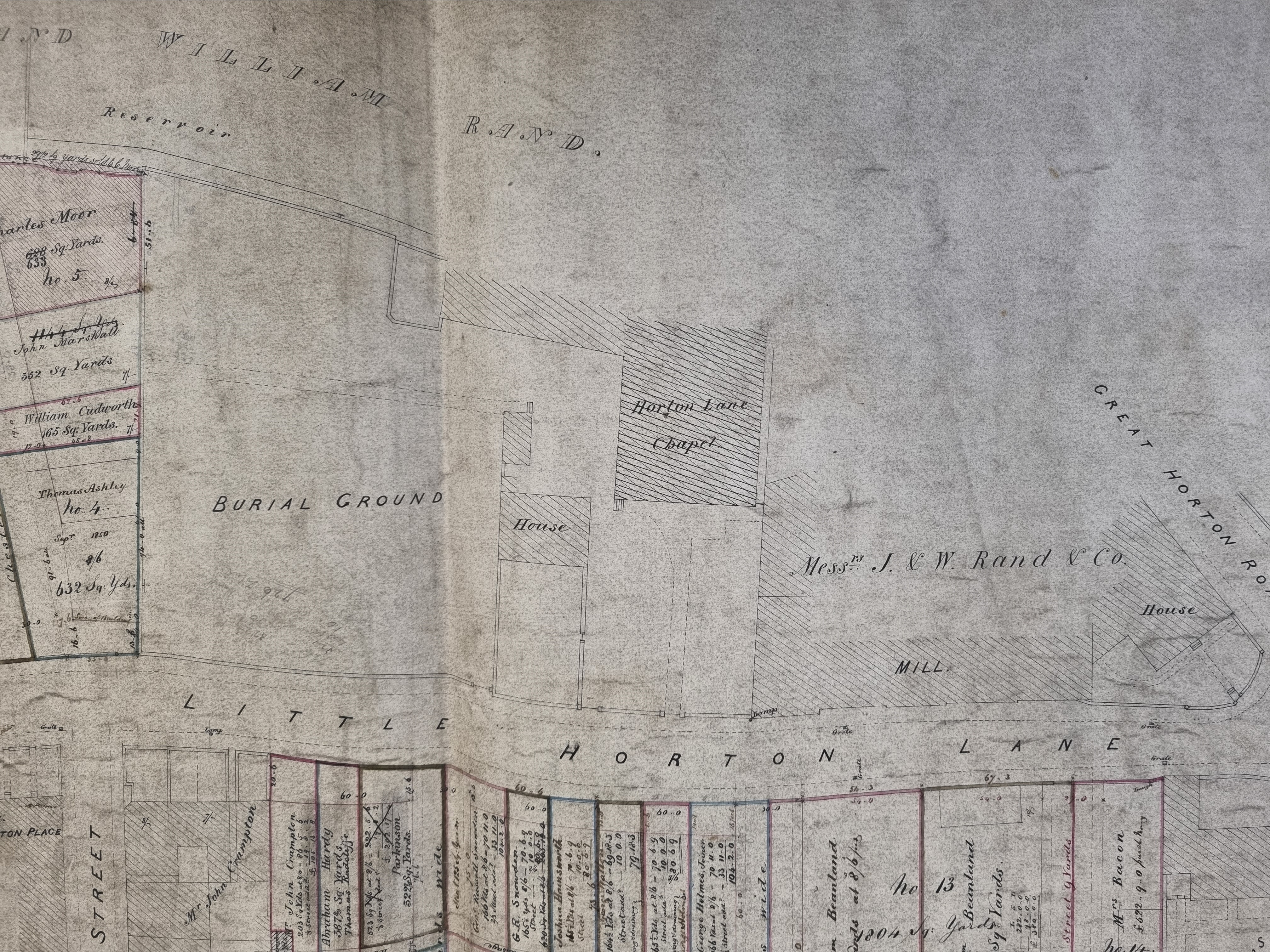 To the left side of the next figure note an embryo Wilton Street. A Samuel Woodhead has purchase three plots making an entire street frontage: useful if you were a developer planning back to backs. But the only man of this name in the 1850 Directory is said to be ‘high bailiff of the county court’, living at Nutter’s Place, Northgate. At the top of the map notice ‘a ditch reserved for Rev. Godfrey Wright’. I assume this is a ‘ransom strip’ which would give Wright a financial interest if Rands Mill wished to extend into the mapped area.