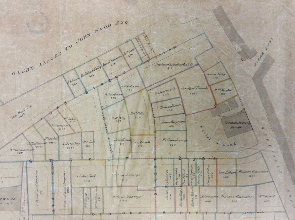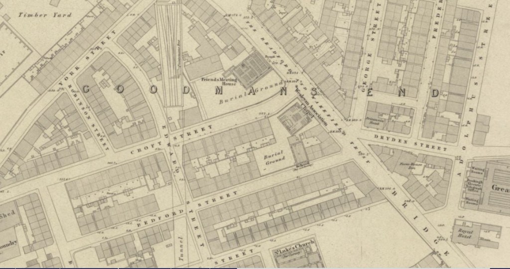 Recently I have been using his map as a resource for a study of Victorian places of worship in Bradford. At the top right of the second image is the meeting house of the Society of Friends (Quakers). This part of Bradford was known as Goodman’s End and the meeting house had been built here in 1811 and enlarged in 1825. It was finally closed in 1877 when a railway company purchased the site.