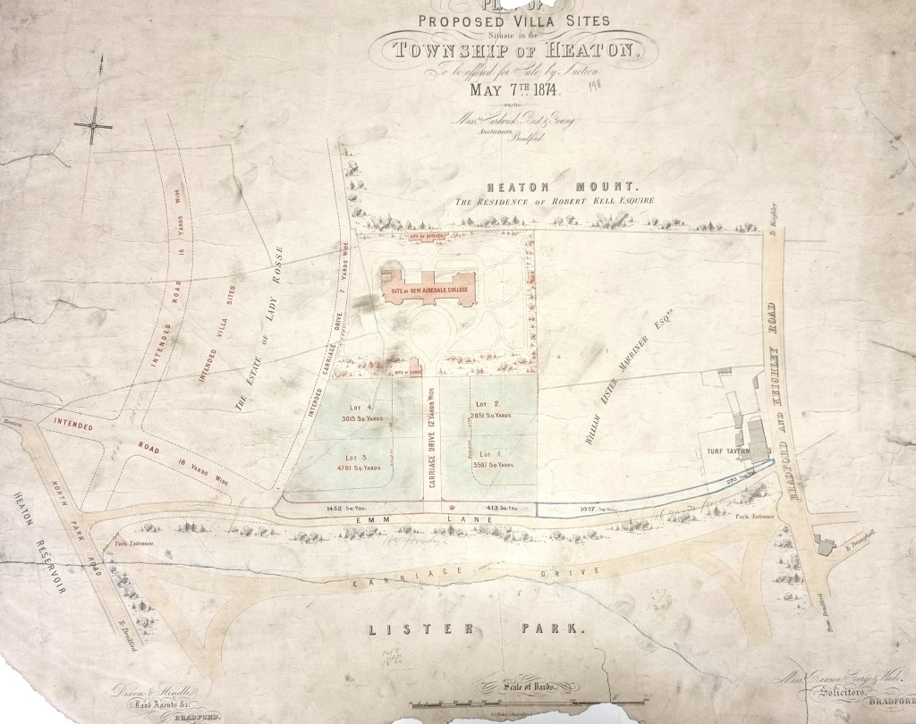 Higher up Emm Lane you can see that the new Airedale College is planned. The beautiful Grade II listed building was probably built the following year. It had formed part of the University of Bradford’s Management Centre since 1963 but has recently (2021) been sold. Airedale College was dedicated to the training of Congregationalist ministers; an earlier college had been in existence at Undercliffe since 1831. The carriage drive to the lodge does exist but, higher up Emm Lane, the ‘intended carriage drive’ was not constructed. Higher still the name ‘Park Drive’ is pencilled over the intended road. Park Drive still exists and is known for the impressive beauty of the houses built along it. The property further along Keighley Road, recorded at the top of this map, belongs to Robert Kell (1818-1894). Kell was a stuff merchant whose house, Heaton Mount (an impressive Italianate mansion) had been built in 1864 and also eventually formed part of the university management centre.