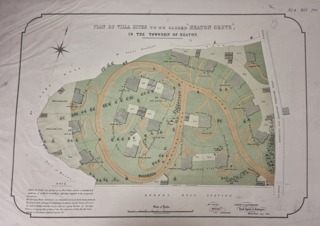 The Turf Tavern building, shorn of a few ancillary structures, is still present today but recently became an Asian restaurant. You can still make the stiff climb up Emm Lane to the airy uplands of Heaton village but at the bottom left of the map the route now follows the ‘intended road’ cutting off a decorative triangle of land which has been planted with trees, and daffodils in season. Back to the right of the map you can see the name of the landowner William Lister Marriner. I would guess that the Rosse auction gave him ideas. Today Marriners Drive exists around the perimeter of his former property which is also covered by impressive housing.
