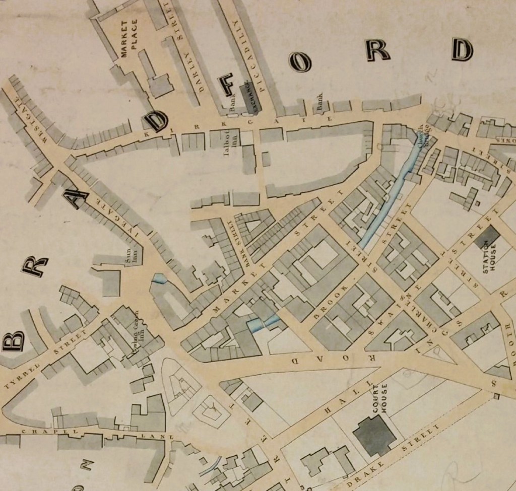 The Local Studies Library reserve collection contains many planning maps. In the mid-nineteenth century the Borough of Bradford had clearly embarked on a series of projects to widen its stock of roads, and to create pavements or causeways. This involved the compulsory purchase of land with subsequent compensation to the landowner.