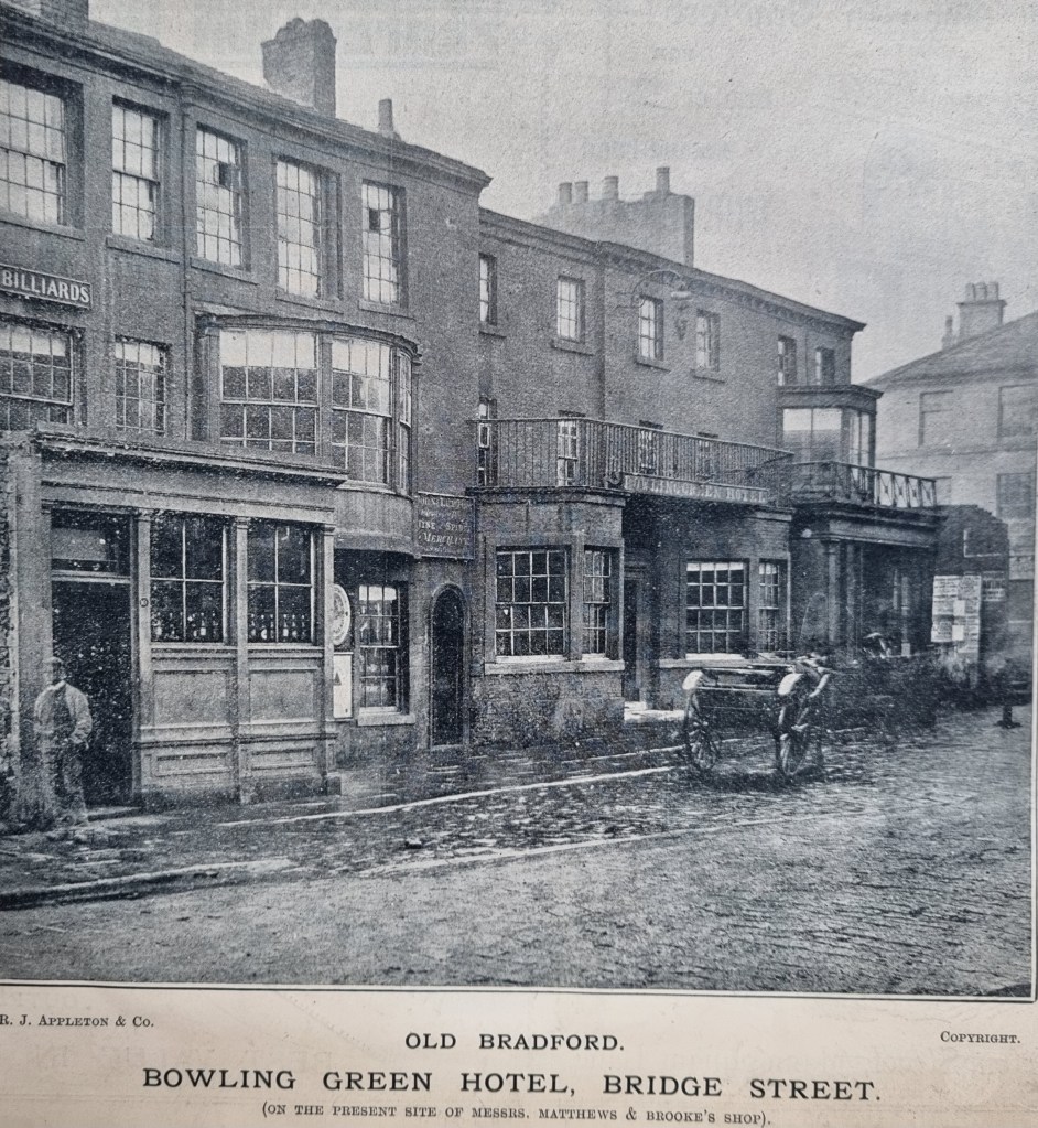 Conveniently placed opposite was the Sun Inn. Bradford pubs and inns are one of the most popular topics among on-line local history groups and now that I am more familiar with the Local Studies Library’s collection of photographs and drawings I can normally find a suitable illustration. In this case I can also show you the Bowling Green Hotel, nearby but actually in Bridge Street, although the images are not exactly contemporary.