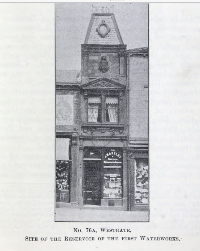 In the picture at the top of Ivegate you may just be able to make out a roof surmounted by an odd-looking pyramidal structure. This marked the end of the first aqueduct to supply Bradford with water, which ended in Westgate. It is more clearly seen in this photograph: