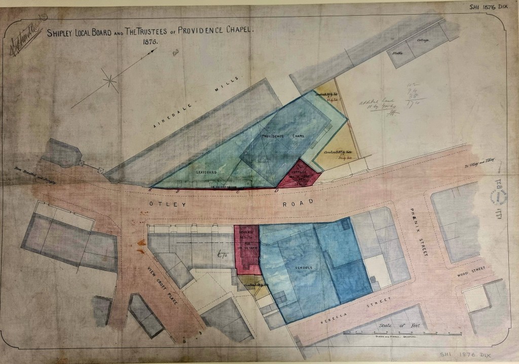 Regular readers will know that I am trying to assemble a accurate database of all the nineteenth century places of worship in Bradford. The Local Studies Library has this plan of 1876 which was produced by Shipley Local Board, effectively the town council, and the Providence Chapel trustees.