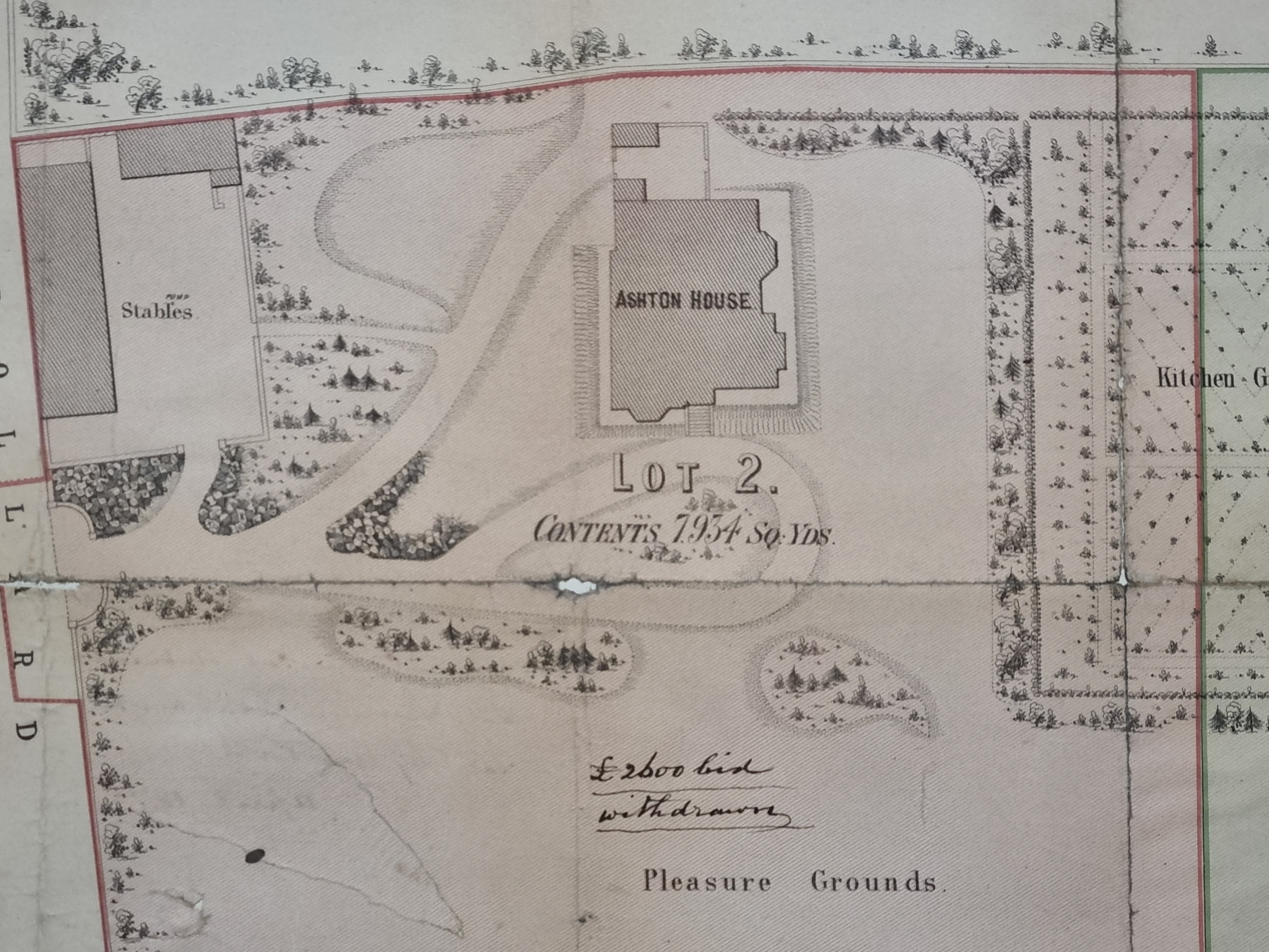 Ashton House was being offered as a spacious residence with land suitable for villa development also available. It’s quite possible that the house didn’t sell at auction since in December 1875 it was again being offered for sale, now by private treaty. It was then in ‘temporary occupation’ by Colonel Broadley Harrison.