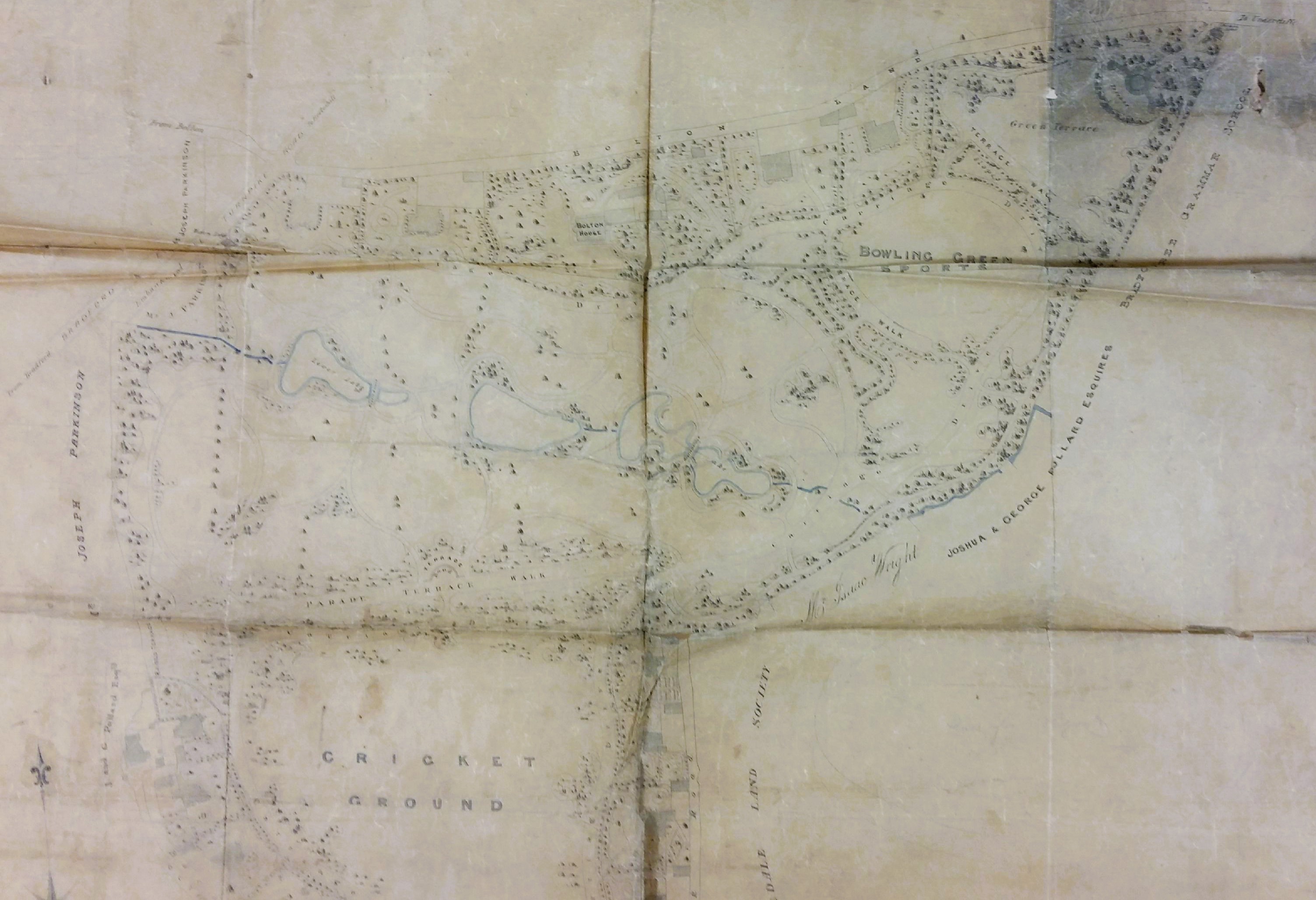 I have been working with three plans, supplemented by OS maps of the area. All were surveyed and drawn by professional surveyors. The 1854 map (figure 1) was drawn by Bradford surveyor Thomas Dixon and is annotated in pencil. Three substantial lakes are indicated: Lower, Middle and Upper. Both the Lower and Upper Lakes are divided by rustic bridges, which can be seen well in the detail which forms the second figure.
