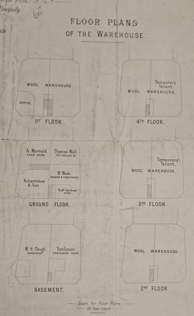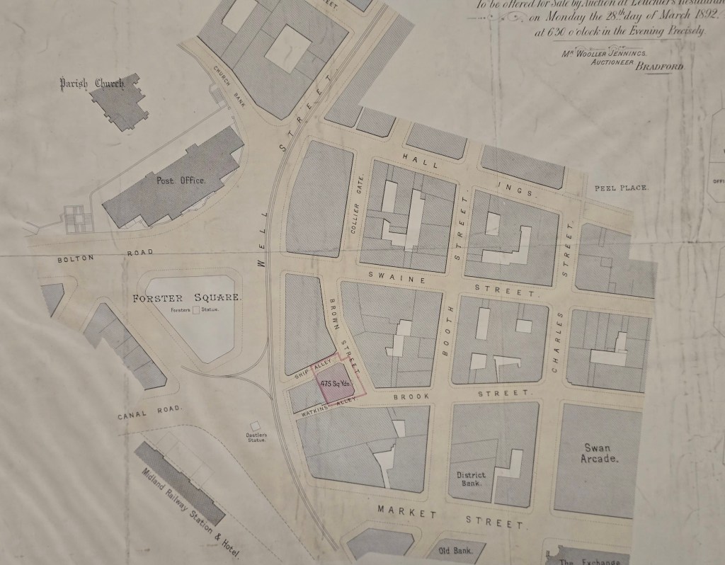 The last map, dealing with the Low Moor supplied coal staithe, attracted some highly interesting and informative comment from local historian Kieran Wilkinson. From his own study of maps and newspaper reports he demonstrated how difficult it is to obtain an exact date for a less than historical event, such as the closure of a coal yard. He believes that Foster’s Building, which was built on the site of the coal staithe, was opened in 1857. I hoped, as a thank you, I could find another Local Studies Library plan showing this area. The selected item was devised for the sale of a wool warehouse between Ship Alley and Watkins Alley.