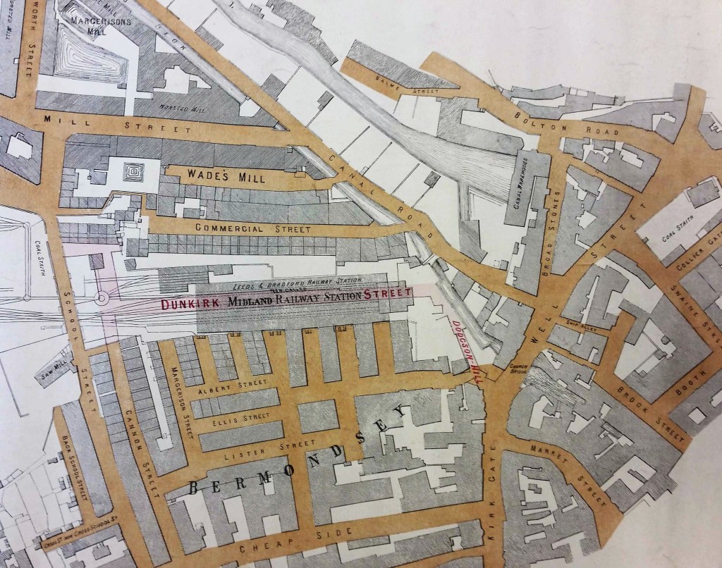 When I previously posted the first map I made two mistakes. The map carries the date 1849 but Kieran Wilkinson pointed out that the case involved took place in 1864, around the time of this second map. Litigation was brought by the Corporation over whether Commercial Street remained a public highway after the Midland Station had been built, or not. The Midland Railway Company maintained that it was their private property, but the Corporation claimed that it was a public highway, and won. I also assumed that the terminus itself was once called ‘Dunkirk Street Station’, but now I cannot confirm this name was ever used officially. Does any reader know?