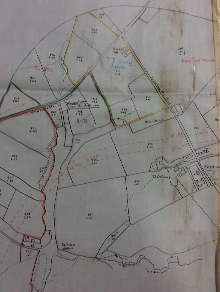 This map (5.019 H) records an area south of Rooley Lane. It is drawn on waxed paper and is associated with other plans whose ultimate origin seems to be Bradford City Council. A 1959 date is written on one area of the map. Originally, I gave this plan a date of c.1960, but this must be at least 5 years too early. Although the original map seems to deal with property and field boundaries, additional information has been subsequently added. Some of this reflects the use to which the fields are being put. It is a detailed plan of the area identifying farm names and associated fields. Pig-breeding, and dairy herds are marked. ‘TT’ herds indicates ‘tuberculin tested’: this designation was introduced pre-War but must be post 1935. There are also planned road developments marked in broken red lines. The plan is annotated with ‘information from geology map’. Surprisingly, but interesting to me, it records a good deal of detail of this type. Perhaps this indicates areas to be avoided during the envisaged road construction.