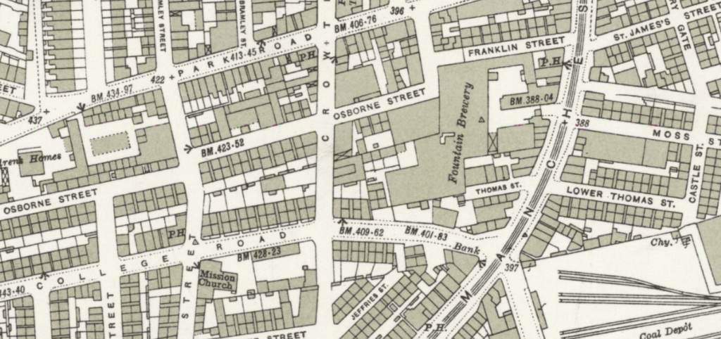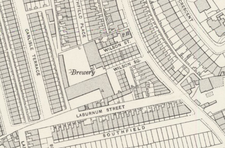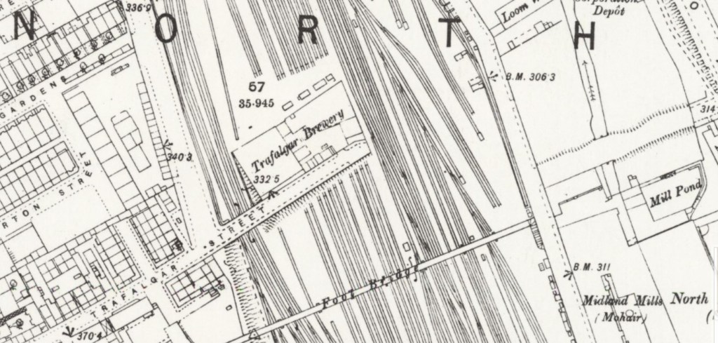 This second detail from the 25” OS of 1890 shows the Trafalgar Steam Brewery in Trafalgar Street. It had been founded in the 1853 and was associated with the name of Cllr. Charles Waller. The company regularly advertised its porter, mild, and bitter beers in the pages of local newspapers and own about 90 pubs across the city. I understand it was sold to the Midland Railway Company during the Great War, but the building survived until the 1950s. But I’m really not sure what they did with the steam.