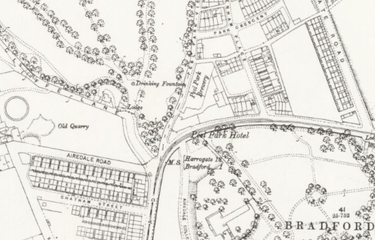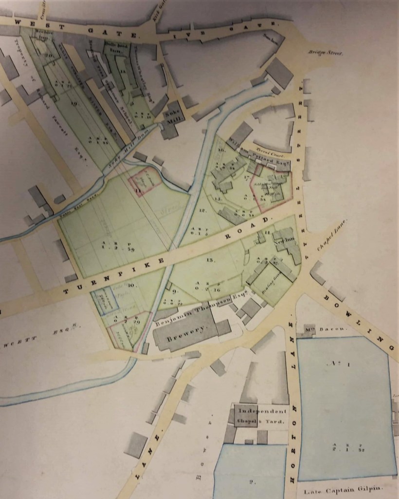 A contemporary of the Fountain Brewery in the 1851 Trade Directory is William Whitaker’s ‘Old Brewery’ in Great Horton Road, but it was older than this. John Whitaker acquired the brewery in 1763. In 1861 it built an entrance to the brewery yard off Thornton Road. There was an association between William Whitaker and a Benjamin Thompson (brewer); the brewery is given Thompson’s name the above image which is a detail from Rev. Godfrey Wright’s property map. Brewing at Whitaker’s ‘Old Brewery’ ceased in 1928 although the company continued as an owner of public houses. The site was sold off for the construction of the New Victoria cinema, later the Odeon.