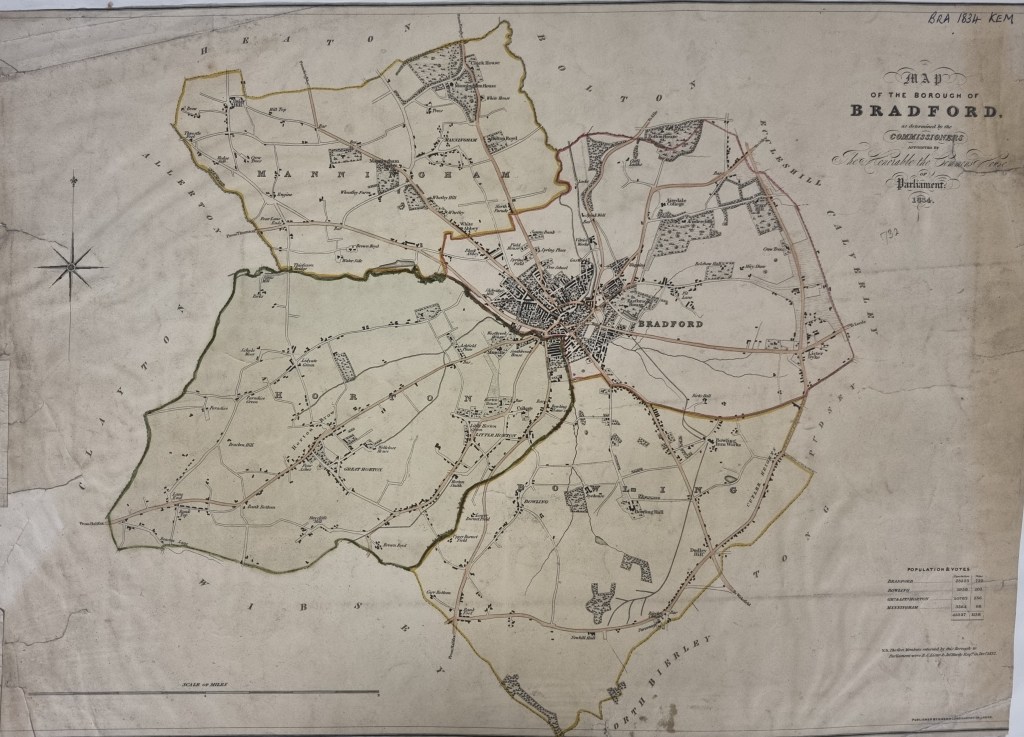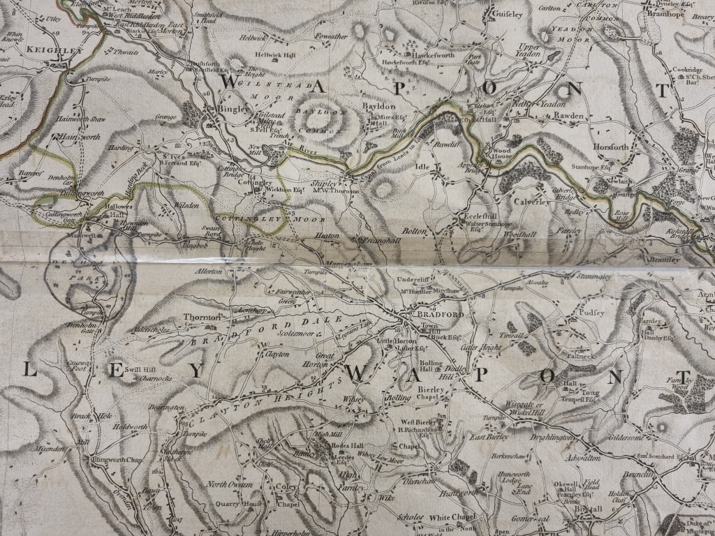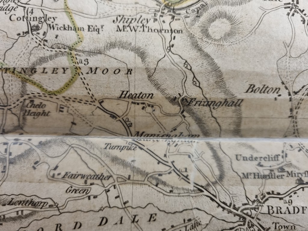 We are fortunate to have quite early plans of portions of Bradford, drawn for legal or land-ownership purposes. Horton, a part of Heaton, and Manningham are recorded in this way. To the best of my knowledge this 1771 map of The County of York by Thomas Jefferys is the first that shows the whole of Bradford and its surroundings. Jefferys (1719 – 1771) was the leading cartographer of his day. He produced a series of maps of the English counties and this one was published right at the end of his life. The York map was dedicated to Charles Watson Wentworth, Marquis of Rockingham. The details here are taken from Sheet 7. The names of principal landowners and their seats are provided, possibly because they were a likely market for sale of the maps. The map predates the railway lines but some turnpike roads already exist. They Leeds-Liverpool canal is drawn, although it was only under construction in 1771. There is not yet a canal spur to Bradford (opened 1774).
