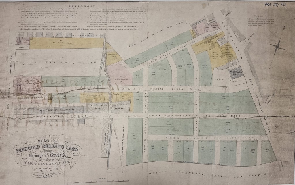 The final map is presented as a reminder of how much more information is contained within sale plans, which is why I provide so many of them. Three years after the 1834 parliamentary map Samuel Hailstone is selling off his land in the town centre. As you can see we are in the area of Goodmansend and Bridge Street. You can find Bridge Street on the Parliamentary map and another cross marks the location of the Friends (Quaker) Meeting House. Then compare the two maps!